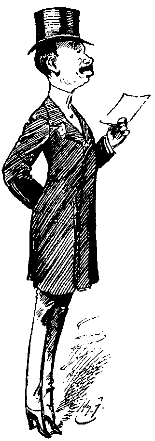 Fifth S.C. (a fat, fair man, with an impudent frog-face, who is trying desperately hard to take in a sceptical crowd with the too familiar purse-trick). Now look 'ere, I don't mind tellin' yer all, fair an' frank, I'm 'ere to get a bit, if I can; but, if you kin ketch me on my merits, why, I shan't grumble—I'll promise yer that much! Well, now—(to a stolid and respectable young Clerk)—jest to show you don't know me, and I don't know you—(he throws three half-crowns into the purse). There, 'old that for me. Shut it. (The Clerk does so, grinning.) Thank you—you're a gentleman, though you mayn't look like it—but perhaps you're one in disguise. Now gimme 'arf a crown for it. Yer won't? Any one gimme arf a crown for it? Why—(unprintable language)—if ever I see sech a blanky lot o' mugs in my life! 'Ere, I'll try yer once more! (He does.) Now oo'll gimme arf a crown for it? (To a Genteel Onlooker, with an eyeglass, who has made an audible comment) "See 'ow it's done!" So yer orter, with a glazier's shop where yer eye orter be! Well, if anyone had 'a told me I should stand 'ere, on Boat-Race Day too, orferin' six bob for arf a crown, and no one with the ordinary pluck an' straightforwardness to take me at my word, I'd have suspected that man of tellin' me a untruth! (To a simple-looking spectator.) Will you 'old this purse for me? Yer will? Well. I like the manly way yer speak up! (Here the Gent. Onl., observing a seedy man slinking about outside, warns the company to "mind their pockets"—which excites the Purse-seller's just indignation.) "Ere!—(to the G.O.) you take your 'ook! I've 'ad enough o' you. I 'ave. You're a bloomin' sight too officious, you are! Not much in your pockets to mind—'cept the key o' the street, and a ticket o' leave, I'll lay! If you carn't beyave as a Gentleman among Gentlemen, go 'ome to where you 'ad your 'air cut last—to Pentonville! (The G.O. retires.) There, we shall get along better without 'im. 'Ow long are you goin' to keep me 'ere? Upon my word an' honour, it's enough to sicken a man to see what the world's come to! Where's yer courage? Where's yer own common sense? Where's your faith in 'umin nature? What do yer expect? (Scathingly.) Want me to wrop it up in a porcel, and send it 'ome for yer? Is that what yer waitin' for! Dammy, if this goes on, I shall git wild, and take and give the bloomin' purse a bath! (The Simple Spectator feels in his pockets—evidently for a half-crown.) 'Ere, you look more intelligent than the rest—I'll try yer jest this once. Jest to show yer don't know me, and—(Shouts of "They're off! They're coming!" from the bank; the Purse-seller's audience suddenly melts away, leaving him alone with the Seedy Slinker.) 'Ere, JIM, we may as well turn it up. 'Ere come them blanky boats!