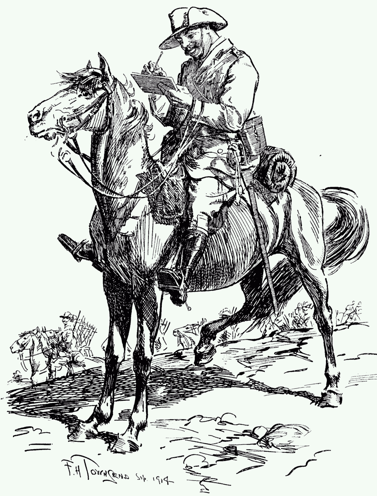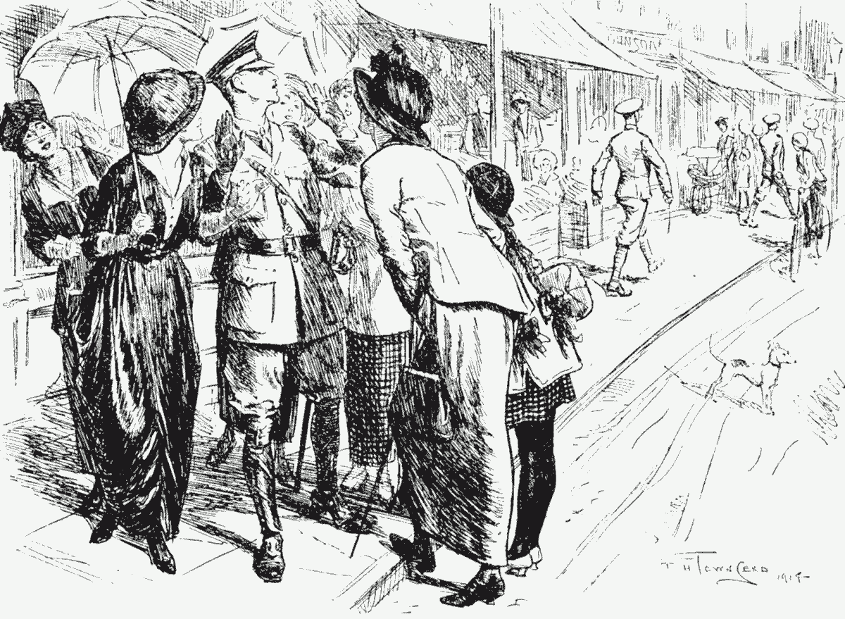 We are the last line of defence. We all have wives or defective retinas or birthdays previous to 1879, or something that binds us together unofficially. Our motto from Monday to Friday is, "Soldier and Civilian too," and in camp at week-ends, "Remember Przemysl." At present we have no uniforms, to the disgust of our wives; but they are coming. Opinion is divided as to whether we want them to come. Some say that, clad in khaki, we shall get admiring glances from the women and envious glances from the small boys which are not really our due; our proud spirit rebels against the idea of marching through London in false colours. James says that, seeing that a soldier is only a soldier, and that he himself (James) is a special constable from 4 A.M. to 8, a dashed hard-working solicitor from 9.30 to 5, and a soldier from 5.30 to 7, not to mention the whole week-end, he jolly well expects all the admiration he can get; and that, if any small boy cheers him under the impression that he is only a Territorial, he is doing him a confounded injustice. Perhaps a tail-coat and khaki breeches would best meet the case.