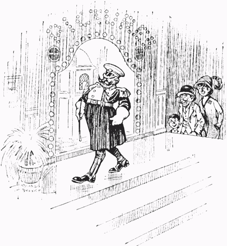 "There is a story here of a reservist, arriving from the provinces, who saw on the Nevsky a brilliantly lighted picture palace, and took off his hat before it and crossed himself devoutly. The point of that story is that the man, when pointed out to me on the parade-ground, was working in rubber gloves upon the installation of field wireless apparatus."—Daily Chronicle.