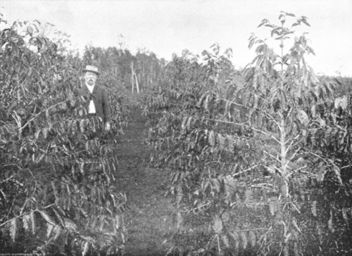 The very first thing the planter should do after obtaining possession of his land is to plant a nursery, so that he may have, as soon as possible, an abundant supply of strong healthy plants. Many planters have planted their fields with wild stumps, these are young coffee plants that are found under wild growths of coffee trees. The young trees are cut off about six inches above the ground, they are then taken up and the lateral roots trimmed close to the tap root. The thready end of the tap root is cut off and the stump is ready to plant. In some cases the young plants are taken up, from under the wild trees, and planted just as they are. This method can be dismissed at once as the worst possible method of planting the coffee tree. The very best plants are strong healthy nursery plants, that is, plants that have been grown from the best seed in a properly prepared nursery. The next best plants to use are nursery 21 stumps. These are nursery trees that have grown too large to safely transplant. By cutting them down and trimming the roots they can be safely transplanted to the field, where they will grow into good healthy trees. Stumps soon after planting send up several shoots, these, with the exception of the strongest one, are taken off. This latter shoot is to grow and make the coffee trees.