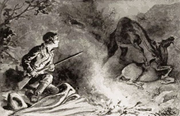 The next morning's sun (for the storm ceased shortly after midnight) found us still upon our blankets, for Uncle Ezra did not intend to go hunting that day, and it was nine o'clock when we got breakfast off our hands and the dishes washed and put away. We were just settling ourselves for another long story—a good one we knew it was going to be, for Uncle Ezra had promised to tell us about the first bear he ever killed—when a far-away and lonely howl came to our ears. It was so lonely that it seemed as if a single wolf was left, and that he was mourning over those who had fallen before the hunter's traps and rifle; but we knew it was not that. We listened, and when the sound was repeated, I threw open the door, and stepped out and set up an answering howl.