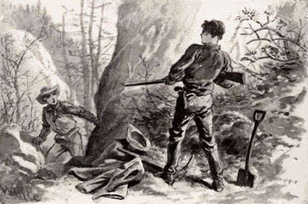 "Wait till I tell you. I don't reckon there is any one thing in the world that has been the cause of so much misery and mischief of all kinds as that there nugget," continued Uncle Ezra reflectively. "The man who found it, whose name was Morgan, and who was working with two pardners, share and share alike, was about as honest as a man ever gets to be, but the sight of the small fortune which he unearthed one day by a single stroke of his pick, while working a little apart from the others, was too much for him. He was as poor as a man ever gets to be, and, worse than all, he had a sweetheart off in the States who was waiting for him to raise a stake and come home and marry her. He didn't like the idea of dividing with his two pardners, who would drop their roll at the faro table as soon as they got the chance, and so he took and buried his find and worked on as if nothing had happened. That is to say, he tried to; but with a big chunk of gold within easy reach of his hand it don't stand to reason that he could act just as he did before. He was uneasy all the time, and his pardners noticed it and suspected something. He took to visiting his nugget's hiding-place every night, to make sure that no one had dug it up, and his pardners found it out on him; and when at last he grew desperate and tried to carry it away secretly, there was some shooting done, and Morgan and one of his pardners were killed."