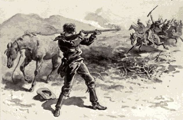 Uncle Ezra was a typical borderman, strong as one of his own mules, and grizzly as any of the numerous specimens of Ursus ferox that had fallen before his big-bored Henry. Although he took no little pride in recounting Ben's exploits to the officers of the garrison, he was very strict with the boy when the latter was under his care, and never permitted him to wander far out of his sight if he could help it.