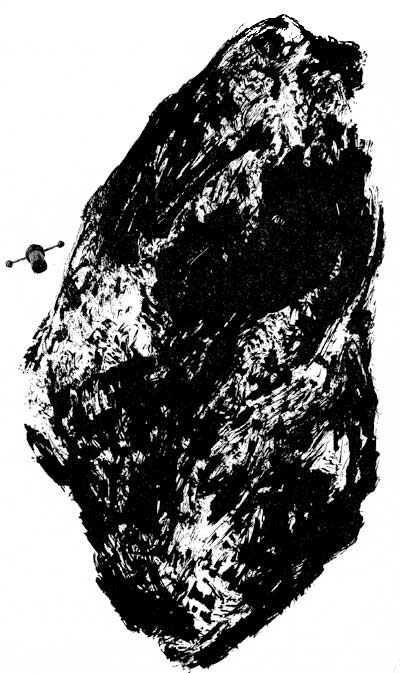"Looks like a big 'un, Jack," said the instrument man. His eyes were on the radar screen. It not only gave him a picture of the body of the slowly spinning mountain, but the distance and the angular and radial velocities. A duplicate of the instrument gave the same information to the pilot.