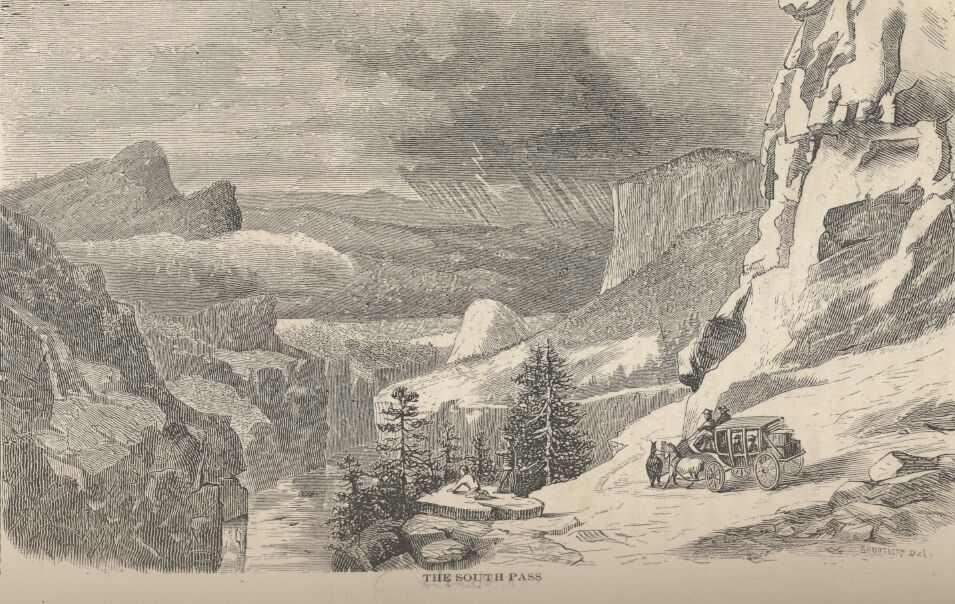 And now, at last, we were fairly in the renowned SOUTH PASS, and whirling gayly along high above the common world. We were perched upon the extreme summit of the great range of the Rocky Mountains, toward which we had been climbing, patiently climbing, ceaselessly climbing, for days and nights together—and about us was gathered a convention of Nature's kings that stood ten, twelve, and even thirteen thousand feet high—grand old fellows who would have to stoop to see Mount Washington, in the twilight. We were in such an airy elevation above the creeping populations of the earth, that now and then when the obstructing crags stood out of the way it seemed that we could look around and abroad and contemplate the whole great globe, with its dissolving views of mountains, seas and continents stretching away through the mystery of the summer haze.