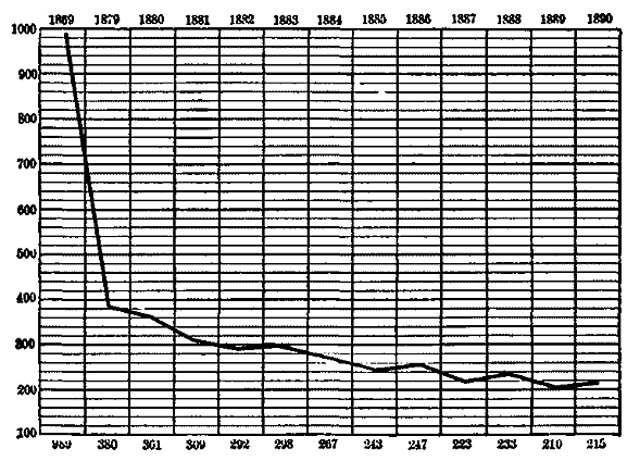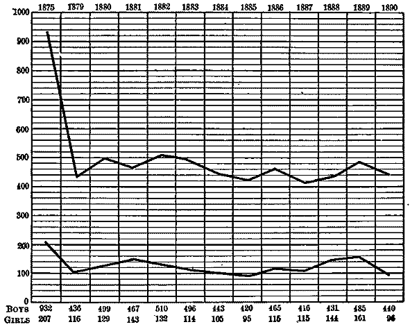 A single fact will show what is meant by that. Within the lifetime of the Children’s Aid Society, in the thirty years between 1860 and 1890, while the population of this city was doubled, the commitments of girls and women for vagrancy fell off from 5,880 to 1,980, while the commitments of girl thieves fell between 1865 and 1890 from 1 in 743 to 1 in 7,500.[2] Stealing and vagrancy among boys has decreased too; if not so fast, yet at a gratifying rate.
