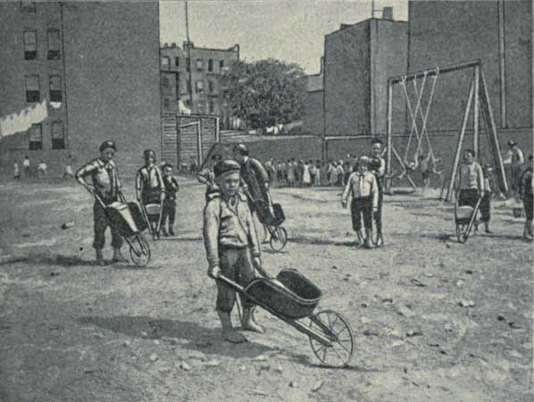 In other words, the child is a creature of environment, of opportunity, as children are everywhere. And the environment here has been bad, as it was and is in the lands across the sea that sent him to us. Our slums have fairly rivalled, and in some respects outdone, the older ones after which they patterned. Still, there is a difference, the difference between the old slum and the new. The hopelessness, the sullen submission of life in East London as we have seen it portrayed, has no counterpart here; neither has the child born in the gutter and predestined by the order of society, from which there is no appeal, to die there. We have our Lost Tenth to fill the trench in the Potter’s Field; quite as many wrecks at the finish, perhaps, but the start seems fairer in the promise. Even on the slums the doctrine of liberty has set its stamp. To be sure, for the want of the schooling to decipher it properly, they spell it license there, and the slip makes trouble. The tough and his scheme of levying tribute are the result. But the police settle that with him, and when it comes to a choice, the tough is to be preferred to the born pauper any day. The one has the making of something in him, unpromising as he looks; seen in a certain light he may even be considered a hopeful symptom. The other is just so much dead loss. The tough is not born: he is made. The all-important point is the one at which the manufacture can be stopped.