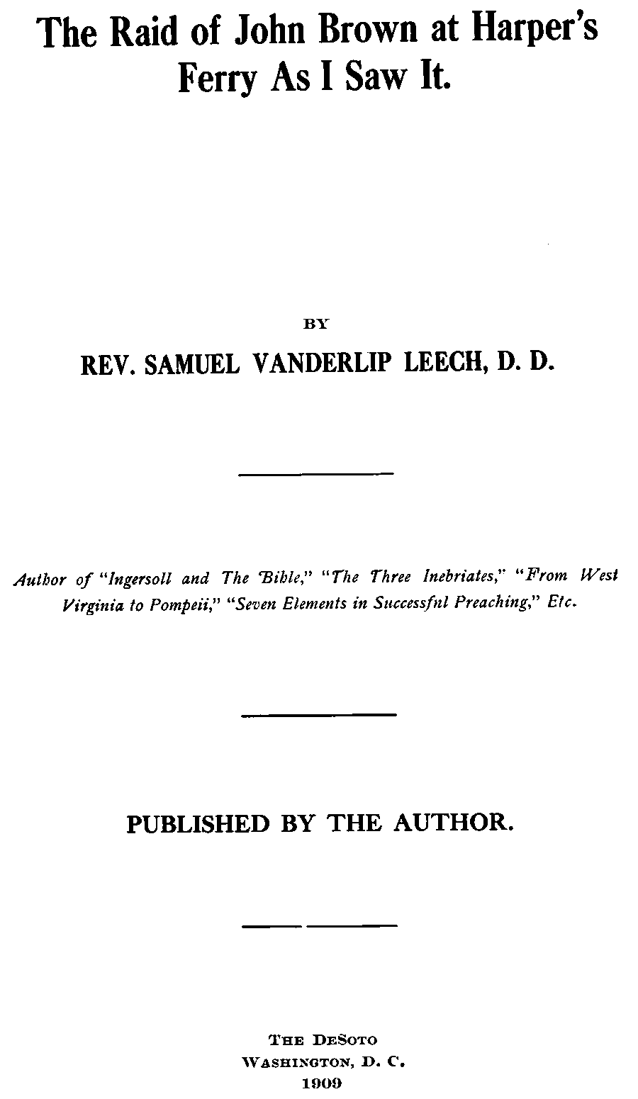There has just been issued a small volume copyrighted, entitled., "The Raid Of John Brown As I Saw It" from the pen of "Rev. Samuel Vanderlip Leech, D. D., of Washington, D. C.," who has been a Methodist Episcopal Minister for 52 years. For this book The Maurice Engraving Company furnished the latest portrait of Captain John Brown. The edition is limited to four hundred copies. They are not sold at any store. The object of the publication is to place on the shelves of Libraries, Colleges, Universities and Historical societies, from the southern standpoint, an accurate narrative of the raid, and the events associated with it. I was 22 years of age, was preaching close to Harper's Ferry, saw the fighting and capture and visited Brown in his prison. I was a witness of the events of the forty four days intervening between the raid and his execution.
