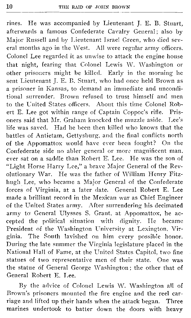 As night was settling on the excited city a military company from Winchester, Virginia, commanded by Captain B. B. Washington, arrived by a Shenandoah Valley train. Shortly thereafter a Baltimore and Ohio railroad train brought several companies of soldiers from Frederick, Maryland. They were commanded by Colonel Shriver. Soon several independent companies from Baltimore, accompanied by the Second Light Brigade, arrived under the general command of General Charles C. Edgerton. Colonel Robert E. Lee of the United States army, overtook these troops at Sandy Hook, a mile and a half below the Ferry on the Maryland side. He had come from Washington with several companies of [10]marines. He was accompanied by Lieutenant J. E. B. Stuart, afterwards a famous Confederate Cavalry General; also by Major Russell and by Lieutenant Israel Green, who died several months ago in the West. All were regular army officers. Colonel Lee regarded it as unwise to attack the engine house that night, fearing that Colonel Lewis W. Washington or other prisoners might be killed. Early in the morning he sent Lieutenant J. E. B. Stuart, who had once held Brown as a prisoner in Kansas, to demand an immediate and unconditional surrender. Brown refused to trust himself and men to the United States officers. About this time Colonel Robert E. Lee got within range of Captain Coppoc's rifle. Prisoners said that Mr. Graham knocked the muzzle aside. Lee's life was saved. Had he been then killed who knows that the battles of Antietam, Gettysburg, and the final conflicts north of the Appomattox would have ever been fought? On the Confederate side no abler general or more magnificent man, ever sat on a saddle than Robert E. Lee. He was the son of "Light Horse Harry Lee," a brave Major General of the Revolutionary War. He was the father of William Henry Fitzhugh Lee, who became a Major General of the Confederate forces of Virginia, at a later date. General Robert E. Lee made a brilliant record in the Mexican war as Chief Engineer of the United States army. After surrendering his decimated army to General Ulysses S. Grant, at Appomattox, he accepted the political situation with dignity. He became President of the Washington University at Lexington, Virginia. The South lavished on him every possible honor. During the late summer the Virginia legislature placed in the National Hall of Fame, at the United States Capitol, two fine statues of two representative men of their state. One was the statue of General George Washington; the other that of General Robert E. Lee.