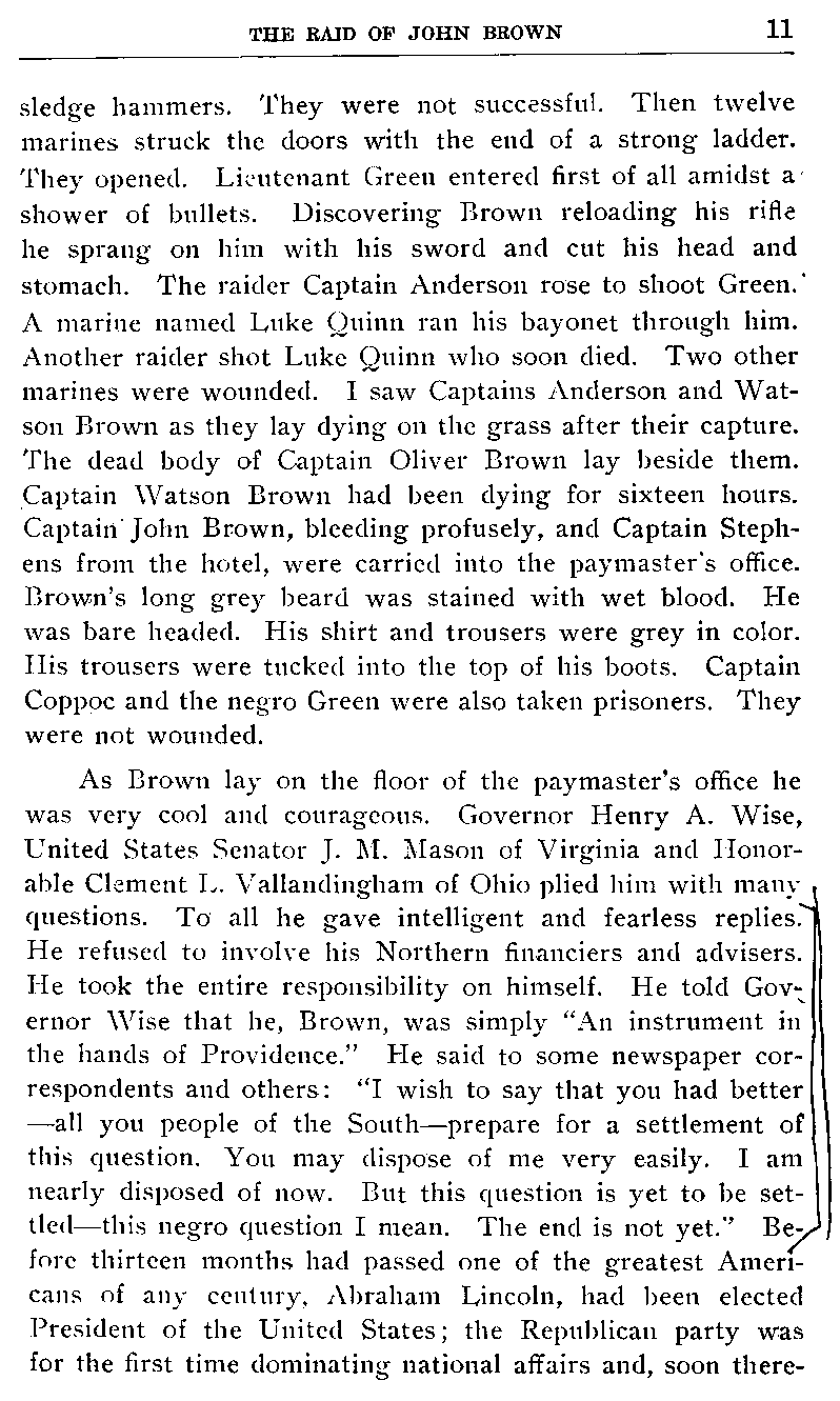By the advice of Colonel Lewis W. Washington all of Brown's prisoners mounted the fire engine and the reel carriage and lifted up their hands when the attack began. Three marines undertook to batter down the doors with heavy [11]sledge hammers. They were not successful. Then twelve marines struck the doors with the end of a strong ladder. They opened. Lieutenant Green entered first of all amidst a shower of bullets. Discovering Brown reloading his rifle he sprang on him with his sword and cut his head and stomach. The raider Captain Anderson rose to shoot Green. A marine named Luke Quinn ran his bayonet through him. Another raider shot Luke Quinn who soon died. Two other marines were wounded. I saw Captains Anderson and Watson Brown as they lay dying on the grass after their capture. The dead body of Captain Oliver Brown lay beside them. Captain Watson Brown had been dying for sixteen hours. Captain John Brown, bleeding profusely, and Captain Stephens from the hotel, were carried into the paymaster's office. Brown's long grey beard was stained with wet blood. He was bare headed. His shirt and trousers were grey in color. His trousers were tucked into the top of his boots. Captain Coppoc and the negro Green were also taken prisoners. They were not wounded.