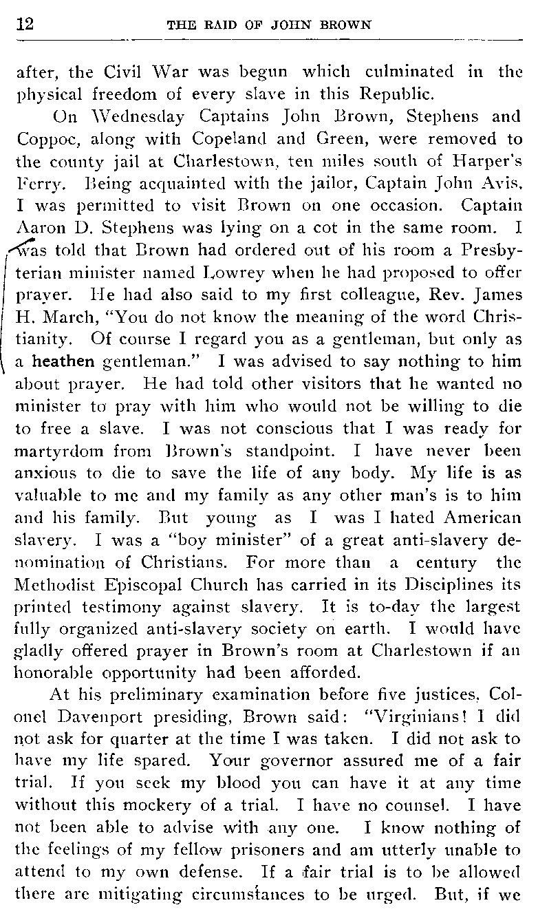 On Wednesday Captains John Brown, Stephens and Coppoc, along with Copeland and Green, were removed to the county jail at Charlestown, ten miles south of Harper's Ferry. Being acquainted with the jailor, Captain John Avis, I was permitted to visit Brown on one occasion. Captain Aaron D. Stephens was lying on a cot in the same room. I was told that Brown had ordered out of his room a Presbyterian minister named Lowrey when he had proposed to offer prayer. He had also said to my first colleague, Rev. James H. March, "You do not know the meaning of the word Christianity. Of course I regard you as a gentleman, but only as a heathen gentleman." I was advised to say nothing to him about prayer. He had told other visitors that he wanted no minister to pray with him who would not be willing to die to free a slave. I was not conscious that I was ready for martyrdom from Brown's standpoint. I have never been anxious to die to save the life of any body. My life is as valuable to me and my family as any other man's is to him and his family. But young as I was I hated American slavery. I was a "boy minister" of a great anti-slavery denomination of Christians. For more than a century the Methodist Episcopal Church has carried in its Disciplines its printed testimony against slavery. It is to-day the largest fully organized anti-slavery society on earth. I would have gladly offered prayer in Brown's room at Charlestown if an honorable opportunity had been afforded.