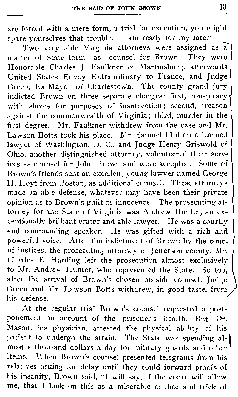 Two very able Virginia attorneys were assigned as a matter of State form as counsel for Brown. They were Honorable Charles J. Faulkner of Martinsburg, afterwards United States Envoy Extraordinary to France, and Judge Green, Ex-Mayor of Charlestown. The county grand jury indicted Brown on three separate charges: first, conspiracy with slaves for purposes of insurrection; second, treason against the commonwealth of Virginia; third, murder in the first degree. Mr. Faulkner withdrew from the case and Mr. Lawson Botts took his place. Mr. Samuel Chilton a learned lawyer of Washington, D. C., and Judge Henry Griswold of Ohio, another distinguished attorney, volunteered their services as counsel for John Brown and were accepted. Some of Brown's friends sent an excellent young lawyer named George H. Hoyt from Boston, as additional counsel. These attorneys made an able defense, whatever may have been their private opinion as to Brown's guilt or innocence. The prosecuting attorney for the State of Virginia was Andrew Hunter, an exceptionally brilliant orator and able lawyer. He was a courtly and commanding speaker. He was gifted with a rich and powerful voice. After the indictment of Brown by the court of justices, the prosecuting attorney of Jefferson county, Mr. Charles B. Harding left the prosecution almost exclusively to Mr. Andrew Hunter, who represented the State. So too, after the arrival of Brown's chosen outside counsel, Judge Green and Mr. Lawson Botts withdrew, in good taste, from his defense.