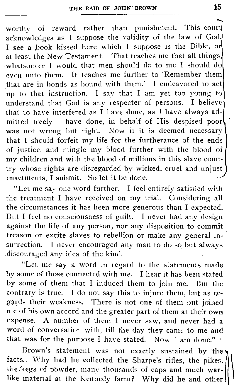 "Let me say a word in regard to the statements made by some of those connected with me. I hear it has been stated by some of them that I induced them to join me. But the contrary is true. I do not say this to injure them, but as regards their weakness. There is not one of them but joined me of his own accord and the greater part of them at their own expense. A number of them I never saw, and never had a word of conversation with, till the day they came to me and that was for the purpose I have stated. Now I am done."