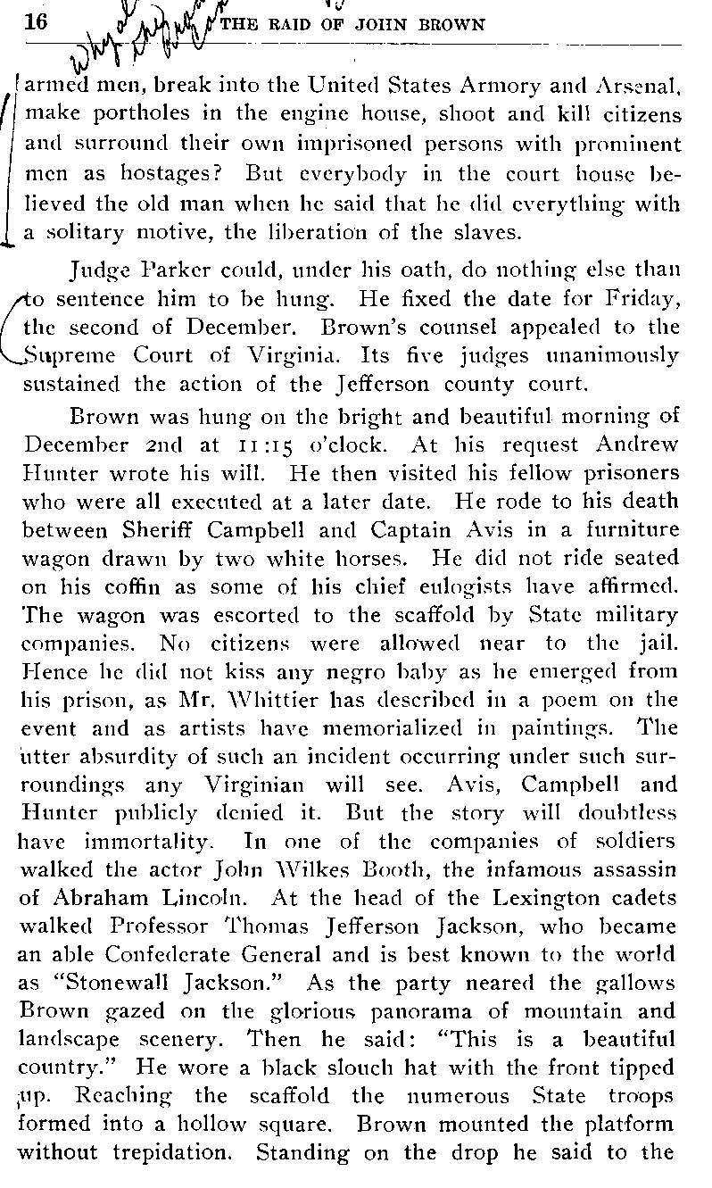 Brown was hung on the bright and beautiful morning of December 2nd at 11:15 o'clock. At his request Andrew Hunter wrote his will. He then visited his fellow prisoners who were all executed at a later date. He rode to his death between Sheriff Campbell and Captain Avis in a furniture wagon drawn by two white horses. He did not ride seated on his coffin as some of his chief eulogists have affirmed. The wagon was escorted to the scaffold by State military companies. No citizens were allowed near to the jail. Hence he did not kiss any negro baby as he emerged from his prison, as Mr. Whittier has described in a poem on the event and as artists have memorialized in paintings. The utter absurdity of such an incident occurring under such surroundings any Virginian will see. Avis, Campbell and Hunter publicly denied it. But the story will doubtless have immortality. In one of the companies of soldiers walked the actor John Wilkes Booth, the infamous assassin of Abraham Lincoln. At the head of the Lexington cadets walked Professor Thomas Jefferson Jackson, who became an able Confederate General and is best known to the world as "Stonewall Jackson." As the party neared the gallows Brown gazed on the glorious panorama of mountain and landscape scenery. Then he said: "This is a beautiful country." He wore a black slouch hat with the front tipped up. Reaching the scaffold the numerous State troops formed into a hollow square. Brown mounted the platform without trepidation. Standing on the drop he said to the [17]sheriff and his assistants: "Gentlemen! I thank you for your kindness to me. I am ready at any time. Do not keep me waiting." The drop fell and in ten minutes Dr. Mason pronounced him dead. That evening Mrs. Brown and her friends received the casket at Harper's Ferry and accompanied it to the old home at North Elba, N. Y. His funeral, as reported by the metropolitan papers, took place there six days after his execution. An immense concourse was in attendance. The conspicuous and brilliant orator, Wendell Phillips, delivered the address. He closed it with these words: "In this cottage he girded himself and went forth to battle. Fuller success than his heart ever dreamed of God had granted him. He sleeps in the blessings of the crushed and the poor. Men believe more firmly in virtue now that such a man has lived." Personally I remained in Virginia.