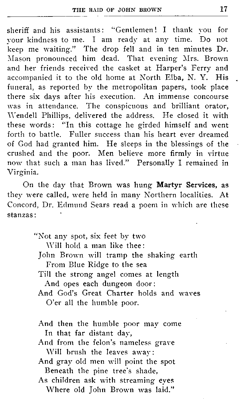 On the day that Brown was hung Martyr Services, as they were called, were held in many Northern localities. At Concord, Dr. Edmund Sears read a poem in which are these stanzas: