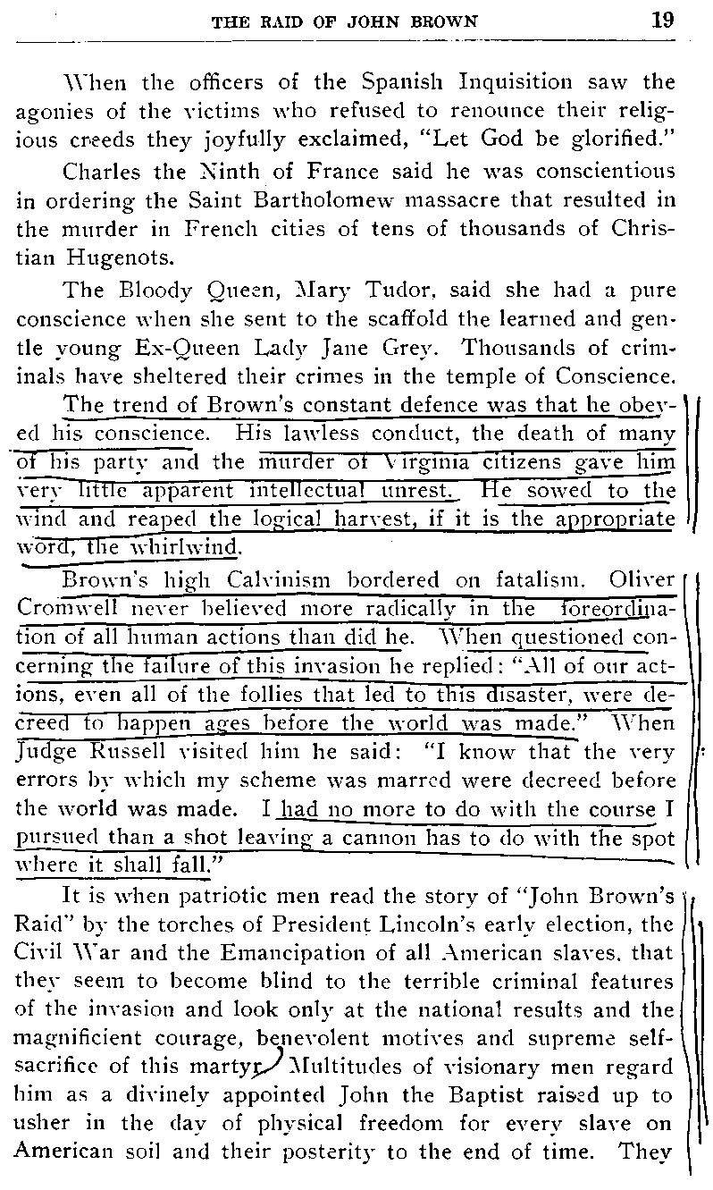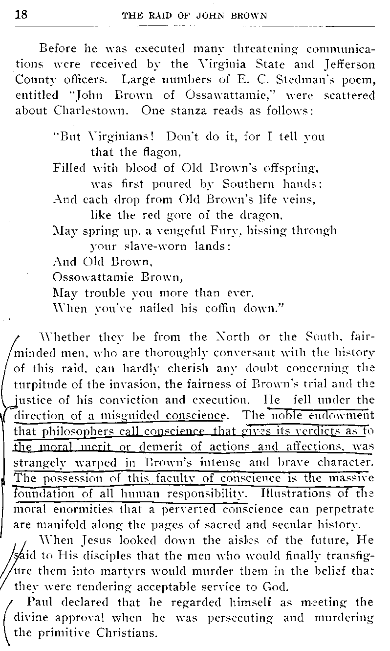 Whether they be from the North or the South, fair-minded men, who are thoroughly conversant with the history of this raid, can hardly cherish any doubt concerning the turpitude of the invasion, the fairness of Brown's trial and the justice of his conviction and execution. He fell under the direction of a misguided conscience. The noble endowment that philosophers call conscience that gives its verdicts as to the moral merit or demerit of actions and affections, was strangely warped in Brown's intense and brave character. The possession of this faculty of conscience is the massive foundation of all human responsibility. Illustrations of the moral enormities that a perverted conscience can perpetrate are manifold along the pages of sacred and secular history.
