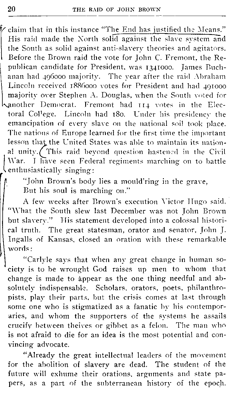 It is when patriotic men read the story of "John Brown's Raid" by the torches of President Lincoln's early election, the Civil War and the Emancipation of all American slaves, that they seem to become blind to the terrible criminal features of the invasion and look only at the national results and the magnificient courage, benevolent motives and supreme self-sacrifice of this martyr. Multitudes of visionary men regard him as a divinely appointed John the Baptist raised up to usher in the day of physical freedom for every slave on American soil and their posterity to the end of time. They [20]claim that in this instance "The End has justified the Means." His raid made the North solid against the slave system and the South as solid against anti-slavery theories and agitators. Before the Brown raid the vote for John C. Fremont, the Republican candidate for President, was 1341000. James Buchanan had 496000 majority. The year after the raid Abraham Lincoln received 1886000 votes for President and had 491000 majority over Stephen A. Douglas, when the South voted for another Democrat. Fremont had 114 votes in the Electoral College. Lincoln had 180. Under his presidency the emancipation of every slave on the national soil took place. The nations of Europe learned for the first time the important lesson that the United States was able to maintain its national unity. This raid beyond question hastened in the Civil War. I have seen Federal regiments marching on to battle enthusiastically singing: