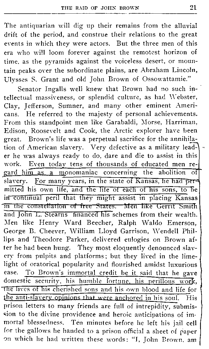 Senator Ingalls well knew that Brown had no such intellectual massiveness, or splendid culture, as had Webster, Clay, Jefferson, Sumner, and many other eminent Americans. He referred to the majesty of personal achievements. From this standpoint men like Garabaldi, Morse, Harriman, Edison, Roosevelt and Cook, the Arctic explorer have been great. Brown's life was a perpetual sacrifice for the annihilation of American slavery. Very defective as a military leader he was always ready to do, dare and die to assist in this work. Even today tens of thousands of educated men regard him as a monomaniac concerning the abolition of slavery. For many years, in the state of Kansas, he had permitted his own life, and the life of each of his sons, to be in continual peril that they might assist in placing Kansas in the constellation of free States. Men like Gerrit Smith and John L. Stearns financed his schemes from their wealth. Men like Henry Ward Beecher, Ralph Waldo Emerson, George B. Cheever, William Lloyd Garrison, Wendell Phillips and Theodore Parker, delivered eulogies on Brown after he had been hung. They most eloquently denounced slavery from pulpits and platforms; but they lived in the limelight of oratorical popularity and flourished amidst luxurious ease. To Brown's immortal credit be it said that he gave domestic security, his humble fortune, his perillous work, the lives of his cherished sons and his own blood and life for the anti-slavery opinions that were anchored in his soul. His prison letters to many friends are full of intrepidity, submission to the divine providence and heroic anticipations of immortal blessedness. Ten minutes before he left his jail cell for the gallows he handed to a prison official a sheet of paper on which he had written these words: "I, John Brown, am [22]quite certain that the crimes of this guilty land will never be purged away but with blood, I had, as I now think, vainly flattered myself that without very much bloodshed it might be done."