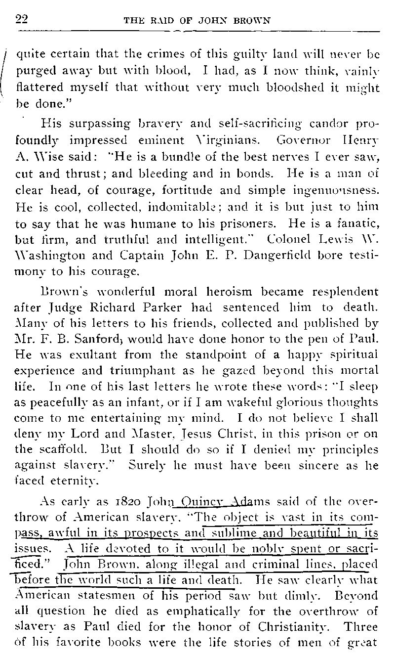 As early as 1820 John Quincy Adams said of the overthrow of American slavery, "The object is vast in its compass, awful in its prospects and sublime and beautiful in its issues. A life devoted to it would be nobly spent or sacrificed." John Brown, along illegal and criminal lines, placed before the world such a life and death. He saw clearly what American statesmen of his period saw but dimly. Beyond all question he died as emphatically for the overthrow of slavery as Paul died for the honor of Christianity. Three of his favorite books were the life stories of men of great [23]achievements:—"The Life of Oliver Cromwell," "The Life of Marco Bozarris," and "The Life of William Wallace."