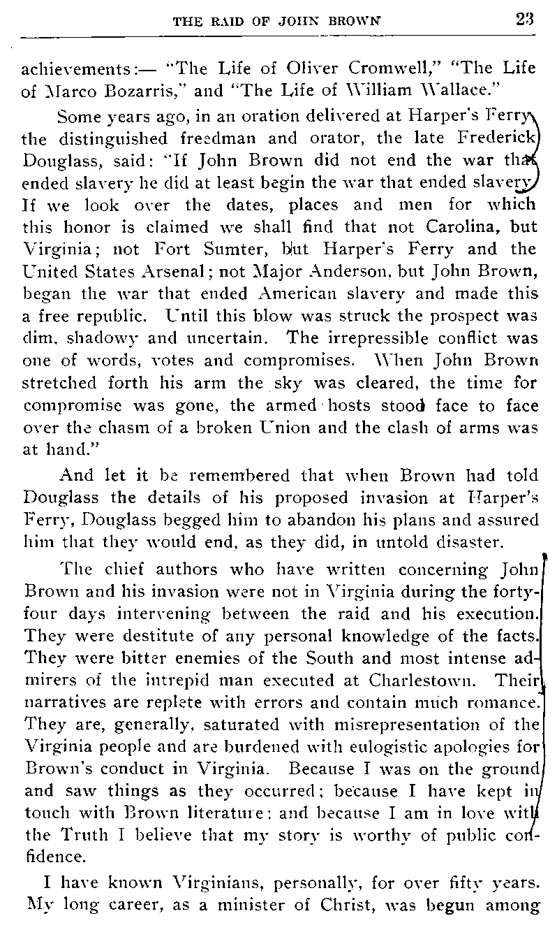 Some years ago, in an oration delivered at Harper's Ferry, the distinguished freedman and orator, the late Frederick Douglass, said: "If John Brown did not end the war that ended slavery he did at least begin the war that ended slavery. If we look over the dates, places and men for which this honor is claimed we shall find that not Carolina, but Virginia; not Fort Sumter, but Harper's Ferry and the United States Arsenal; not Major Anderson, but John Brown, began the war that ended American slavery and made this a free republic. Until this blow was struck the prospect was dim, shadowy and uncertain. The irrepressible conflict was one of words, votes and compromises. When John Brown stretched forth his arm the sky was cleared, the time for compromise was gone, the armed hosts stood face to face over the chasm of a broken Union and the clash of arms was at hand."