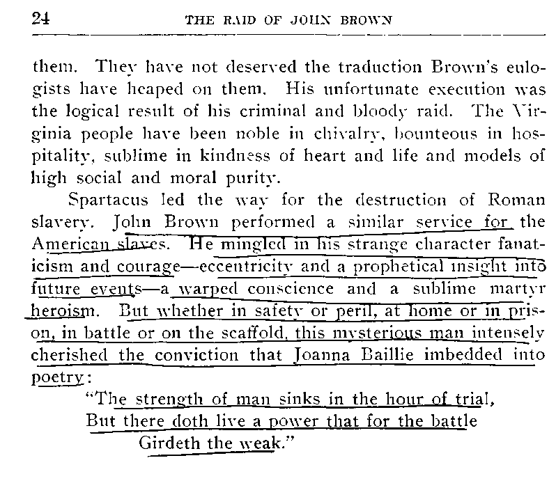 Spartacus led the way for the destruction of Roman slavery. John Brown performed a similar service for the American slaves. He mingled in his strange character fanaticism and courage—eccentricity and a prophetical insight into future events—a warped conscience and a sublime martyr heroism. But whether in safety or peril, at home or in prison, in battle or on the scaffold, this mysterious man intensely cherished the conviction that Joanna Baillie imbedded into poetry: