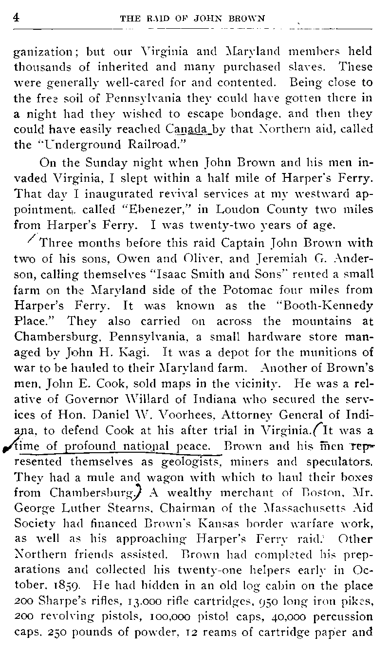 Three months before this raid Captain John Brown with two of his sons, Owen and Oliver, and Jeremiah G. Anderson, calling themselves "Isaac Smith and Sons" rented a small farm on the Maryland side of the Potomac four miles from Harper's Ferry. It was known as the "Booth-Kennedy Place." They also carried on across the mountains at Chambersburg, Pennsylvania, a small hardware store managed by John H. Kagi. It was a depot for the munitions of war to be hauled to their Maryland farm. Another of Brown's men, John E. Cook, sold maps in the vicinity. He was a relative of Governor Willard of Indiana who secured the services of Hon. Daniel W. Voorhees, Attorney General of Indiana, to defend Cook at his after trial in Virginia. It was a time of profound national peace. Brown and his men represented themselves as geologists, miners and speculators. They had a mule and wagon with which to haul their boxes from Chambersburg. A wealthy merchant of Boston, Mr. George Luther Stearns, Chairman of the Massachusetts Aid Society had financed Brown's Kansas border warfare work, as well as his approaching Harper's Ferry raid. Other Northern friends assisted. Brown had completed his preparations and collected his twenty-one helpers early in October, 1859. He had hidden in an old log cabin on the place 200 Sharpe's rifles, 13,000 rifle cartridges, 950 long iron pikes, 200 revolving pistols, 100,000 pistol caps, 40,000 percussion caps, 250 pounds of [5]powder, 12 reams of cartridge paper and other warlike materials. He organized his twenty-two men, himself included, into a "Military Provisional Government" to superintend the possible uprising of the slaves of Virginia. Thirteen of these men had engaged in border warfare in Kansas, in a successful effort to prevent Kansas from becoming a slave state. He, sixteen other white men and five negroes, constituted his entire Virginia army. The white men were Captain John Brown, Adjutant General John H. Kagi, Captains Owen Brown, Oliver Brown, Watson Brown, Aaron D. Stephens, John E. Cook, Dauphin Adolphus Thompson, George P. Tidd, William Thompson and Edwin Coppoc. The Lieutenants were Jeremiah G. Anderson, Albert Hazlitt and William Henry Leeman. The privates numbered eight. Three of them were white men and five were negroes. The whites were Francis J. Merriam, Barclay Coppoc and Steward Taylor. The negroes were Dangerfield Newby, Osborne P. Anderson, John A. Copeland, Sherrard Lewis Leary and Shields Green.