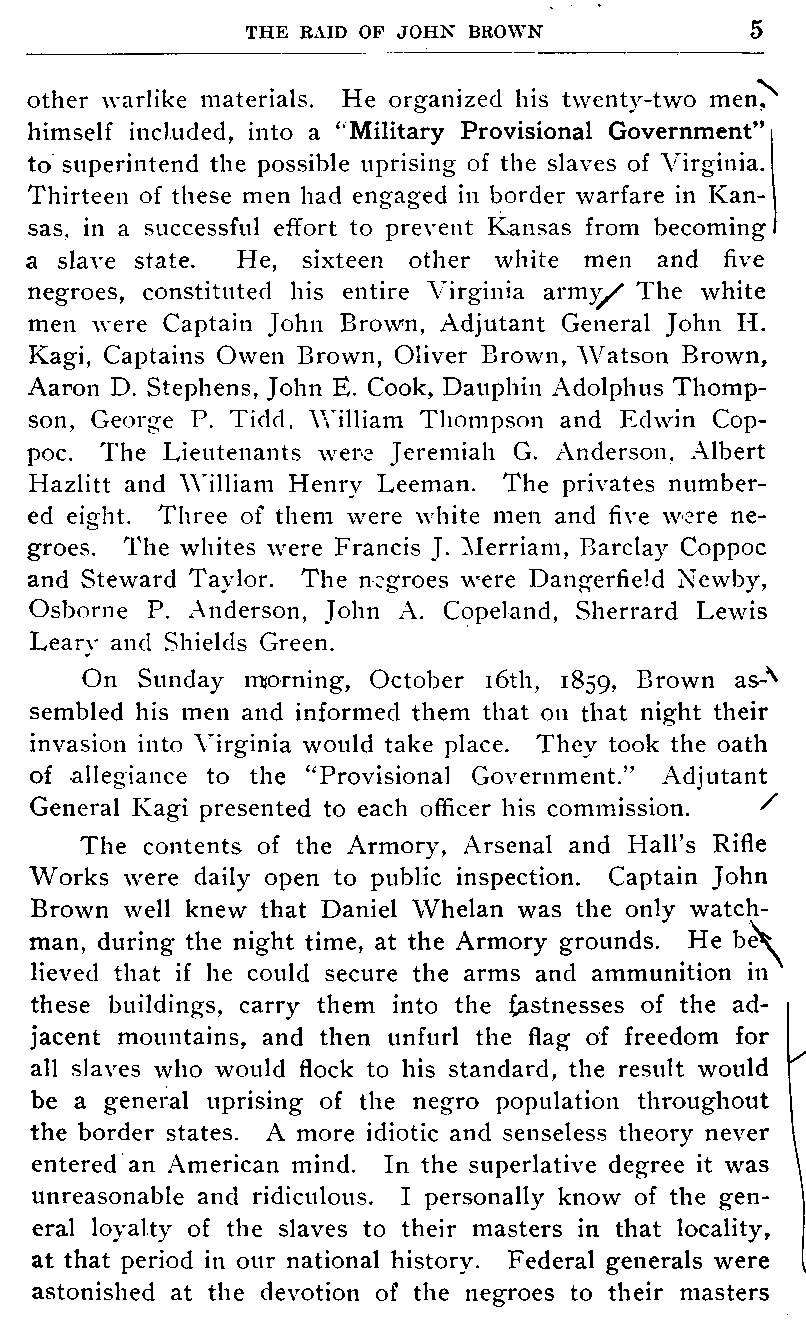 His partisan biographers were not in Virginia at that time. Their books contain historical errors and much romance. Their abuse of the Virginians is unfair. I am a Republican, and have steadily voted for Republican Presidents. But I think the time has come when a truthful version of this famous raid should find a place in national literature. I think that you will agree with me. On receipt of a money order for 45 cents I will mail to you a post-paid copy of this small volume.