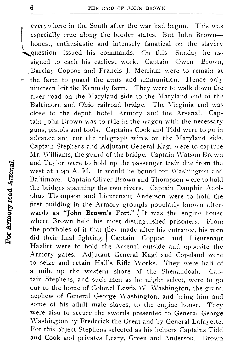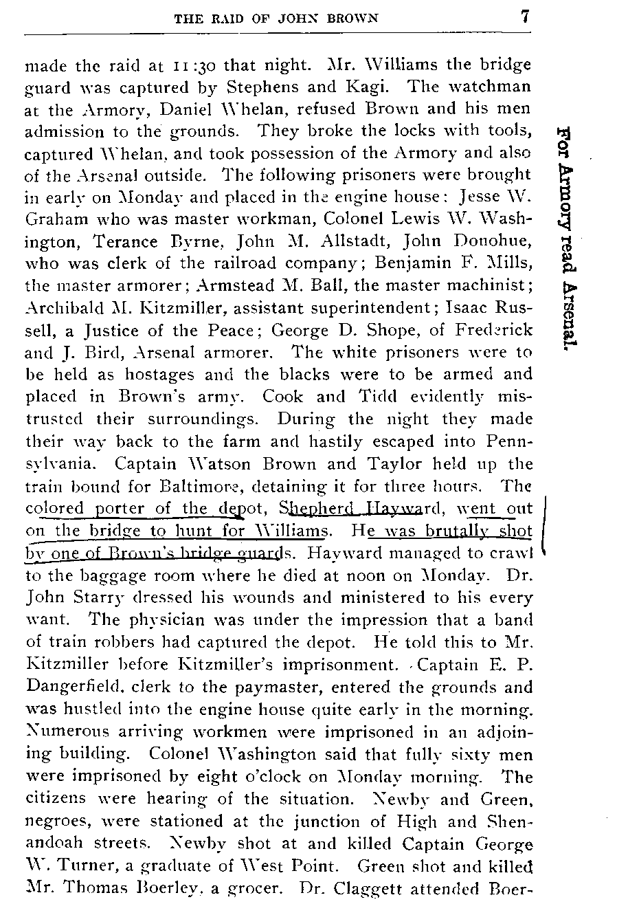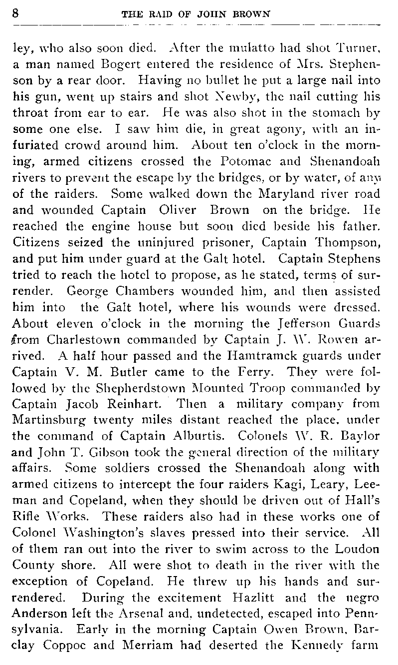 The contents of the Armory, Arsenal and Hall's Rifle Works were daily open to public inspection. Captain John Brown well knew that Daniel Whelan was the only watchman, during the night time, at the Armory grounds. He believed that if he could secure the arms and ammunition in these buildings, carry them into the fastnesses of the adjacent mountains, and then unfurl the flag of freedom for all slaves who would flock to his standard, the result would be a general uprising of the negro population throughout the border states. A more idiotic and senseless theory never entered an American mind. In the superlative degree it was unreasonable and ridiculous. I personally know of the general loyalty of the slaves to their masters in that locality, at that period in our national history. Federal generals were astonished at the devotion of the negroes to their masters [6]everywhere in the South after the war had begun. This was especially true along the border states. But John Brown—honest, enthusiastic and intensely fanatical on the slavery question—issued his commands. On this Sunday he assigned to each his earliest work. Captain Owen Brown, Barclay Coppoc and Francis J. Merriam were to remain at the farm to guard the arms and ammunition. Hence only nineteen left the Kennedy farm. They were to walk down the river road on the Maryland side to the Maryland end of the Baltimore and Ohio railroad bridge. The Virginia end was close to the depot, hotel, Armory and the Arsenal. Captain John Brown was to ride in the wagon with the necessary guns, pistols and tools. Captains Cook and Tidd were to go in advance and cut the telegraph wires on the Maryland side. Captain Stephens and Adjutant General Kagi were to capture Mr. Williams, the guard of the bridge. Captain Watson Brown and Taylor were to hold up the passenger train due from the west at 1:40 A. M. It would be bound for Washington and Baltimore. Captain Oliver Brown and Thompson were to hold the bridges spanning the two rivers. Captain Dauphin Adolphus Thompson and Lieutenant Anderson were to hold the first building in the Armory[6-1] grounds popularly known afterwards as "John Brown's Fort." It was the engine house where Brown held his most distinguished prisoners. From the portholes of it that they made after his entrance, his men did their final fighting. Captain Coppoc and Lieutenant Hazlitt were to hold the Arsenal outside and opposite the Armory gates. Adjutant General Kagi and Copeland were to seize and retain Hall's Rifle Works. They were half of a mile up the western shore of the Shenandoah. Captain Stephens, and such men as he might select, were to go out to the home of Colonel Lewis W. Washington, the grand nephew of General George Washington, and bring him and some of his adult male slaves, to the engine house. They were also to secure the swords presented to General George Washington by Frederick the Great and by General Lafayette. For this object Stephens selected as his helpers Captains Tidd and Cook and privates Leary, Green and Anderson. Brown [7]made the raid at 11:30 that night. Mr. Williams the bridge guard was captured by Stephens and Kagi. The watchman at the Armory[7-1], Daniel Whelan, refused Brown and his men admission to the grounds. They broke the locks with tools, captured Whelan, and took possession of the Armory and also of the Arsenal outside. The following prisoners were brought in early on Monday and placed in the engine house: Jesse W. Graham who was master workman, Colonel Lewis W. Washington, Terance Byrne, John M. Allstadt, John Donohue, who was clerk of the railroad company; Benjamin F. Mills, the master armorer; Armstead M. Ball, the master machinist; Archibald M. Kitzmiller, assistant superintendent; Isaac Russell, a Justice of the Peace; George D. Shope, of Frederick and J. Bird, Arsenal armorer. The white prisoners were to be held as hostages and the blacks were to be armed and placed in Brown's army. Cook and Tidd evidently mistrusted their surroundings. During the night they made their way back to the farm and hastily escaped into Pennsylvania. Captain Watson Brown and Taylor held up the train bound for Baltimore, detaining it for three hours. The colored porter of the depot, Shepherd Hayward, went out on the bridge to hunt for Williams. He was brutally shot by one of Brown's bridge guards. Hayward managed to crawl to the baggage room where he died at noon on Monday. Dr. John Starry dressed his wounds and ministered to his every want. The physician was under the impression that a band of train robbers had captured the depot. He told this to Mr. Kitzmiller before Kitzmiller's imprisonment. Captain E. P. Dangerfield, clerk to the paymaster, entered the grounds and was hustled into the engine house quite early in the morning. Numerous arriving workmen were imprisoned in an adjoining building. Colonel Washington said that fully sixty men were imprisoned by eight o'clock on Monday morning. The citizens were hearing of the situation. Newby and Green, negroes, were stationed at the junction of High and Shenandoah streets. Newby shot at and killed Captain George W. Turner, a graduate of West Point. Green shot and killed Mr. Thomas Boerley, a grocer. Dr. Claggett attended Boerley, [8]who also soon died. After the mulatto had shot Turner, a man named Bogert entered the residence of Mrs. Stephenson by a rear door. Having no bullet he put a large nail into his gun, went up stairs and shot Newby, the nail cutting his throat from ear to ear. He was also shot in the stomach by some one else. I saw him die, in great agony, with an infuriated crowd around him. About ten o'clock in the morning, armed citizens crossed the Potomac and Shenandoah rivers to prevent the escape by the bridges, or by water, of any of the raiders. Some walked down the Maryland river road and wounded Captain Oliver Brown on the bridge. He reached the engine house but soon died beside his father. Citizens seized the uninjured prisoner, Captain Tho