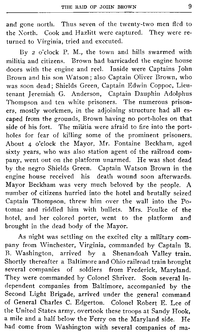 By 2 o'clock P. M., the town and hills swarmed with militia and citizens. Brown had barricaded the engine house doors with the engine and reel. Inside were Captains John Brown and his son Watson; also Captain Oliver Brown, who was soon dead; Shields Green, Captain Edwin Coppoc, Lieutenant Jeremiah G. Anderson, Captain Dauphin Adolphus Thompson and ten white prisoners. The numerous prisoners, mostly workmen, in the adjoining structure had all escaped from the grounds, Brown having no port-holes on that side of his fort. The militia were afraid to fire into the port-holes for fear of killing some of the prominent prisoners. About 4 o'clock the Mayor, Mr. Fontaine Beckham, aged sixty years, who was also station agent of the railroad company, went out on the platform unarmed. He was shot dead by the negro Shields Green. Captain Watson Brown in the engine house received his death wound soon afterwards. Mayor Beckham was very much beloved by the people. A number of citizens hurried into the hotel and brutally seized Captain Thompson, threw him over the wall into the Potomac and riddled him with bullets. Mrs. Foulke of the hotel, and her colored porter, went to the platform and brought in the dead body of the Mayor.