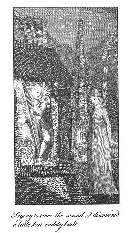 I might remark here that the circumstance that Blake’s drawings for Salzmann’s Elements of Morality, which Mary Wollstonecraft translated in 1791, also for Johnson, are more interesting and dramatic, is due to the fact that he merely adapted the work of the German artist. Blake was uniformly below himself in this kind of employment. Only in the rapt freedoms of the angelic harper in his hut, in the picture opposite page 56 of the present work, does he approach his true genius; while in his conception of Mrs. Mason I have no confidence. Not slim and willowy and pensive was she in my mental picture of her: I figure a matron of sterner stuff and solider build.