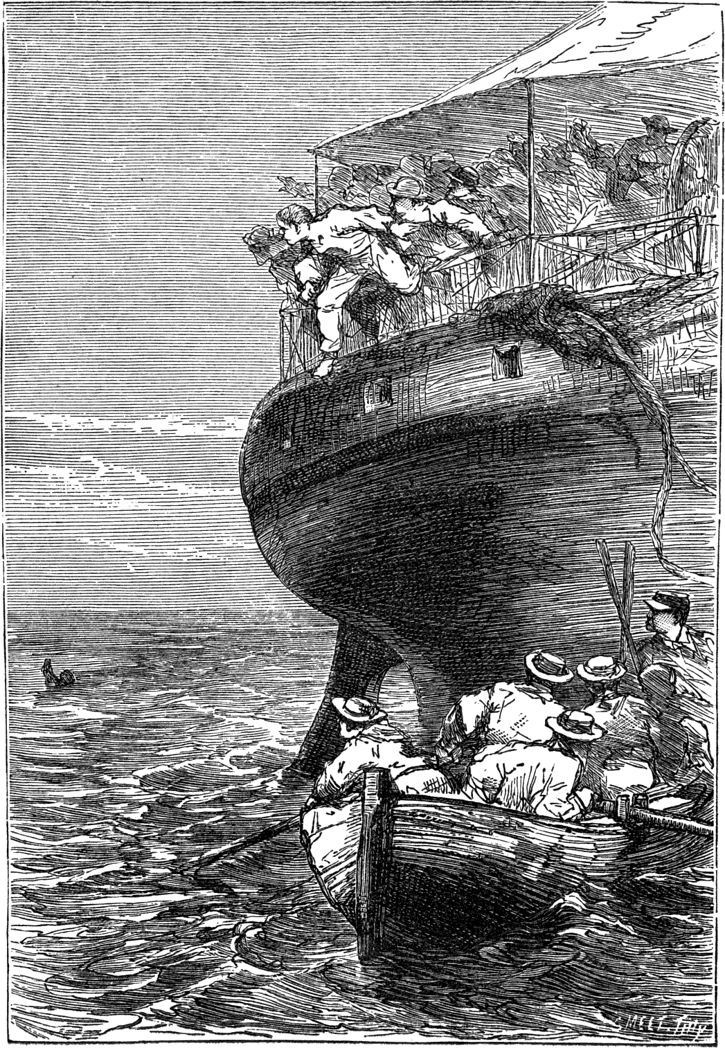 Een daverend gejuich weerklonk van de boot, en de bemanning der sloep repte zich om spoedig den drenkeling en zijn redder te bereiken, die binnen weinige oogenblikken behouden werden aan boord gebracht.