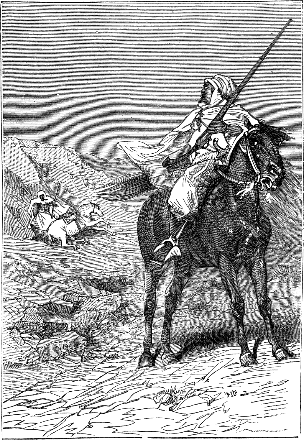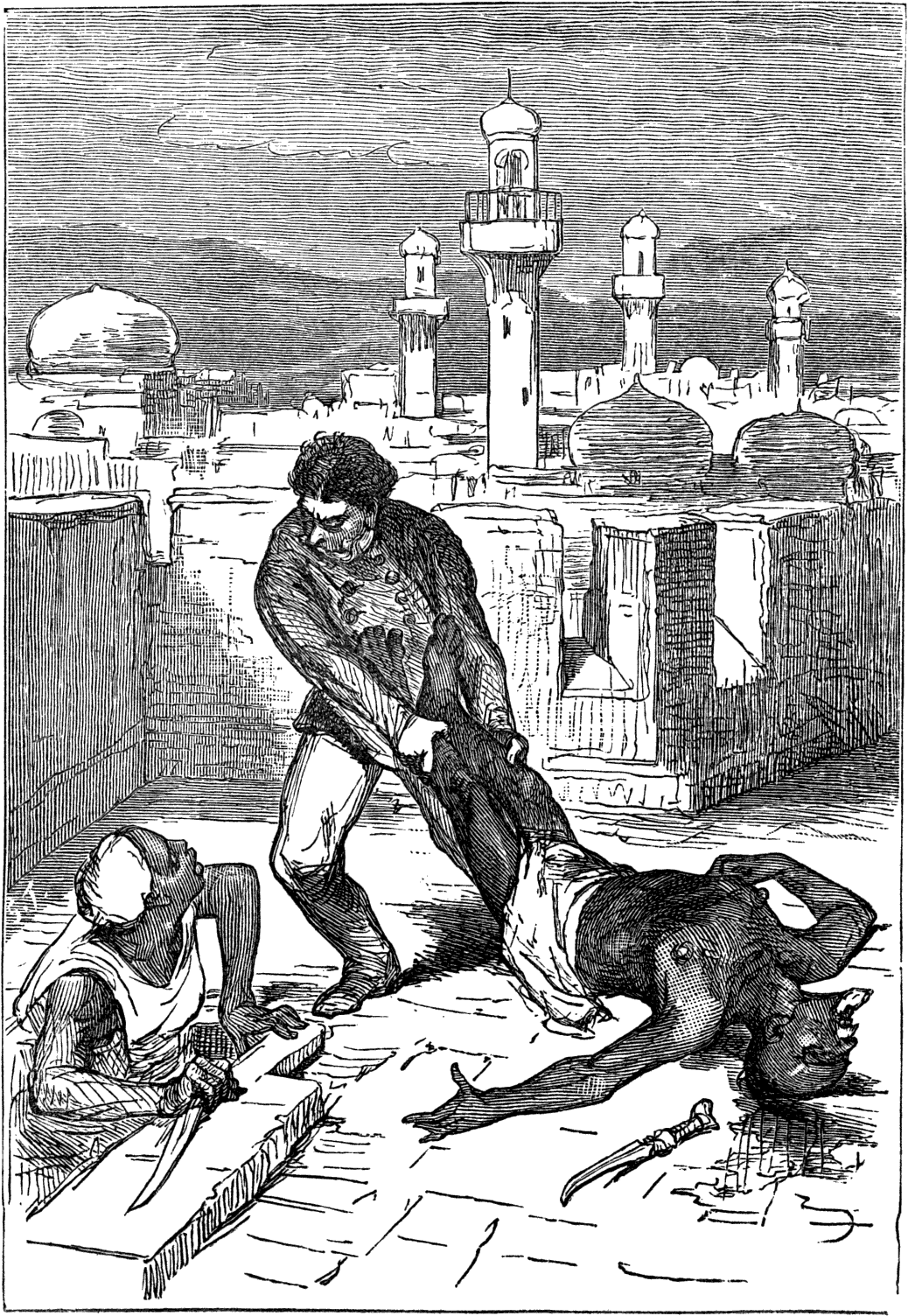 —O, zeide de Franschman, daaraan wordt men weldra gewoon. De Arabieren zijn niet levendig van aard. Die verschillende personen gaan allen daarheen alsof zij bevreesd zijn gerucht te maken. Geen mensch ziet ons, en toch zijn we vreemdelingen en nog wel Christenen. Verplaats u eens in gedachte in eene stad van de beschaafde landen; daar zou men dadelijk van alle kanten worden aangegaapt, nageloopen en uitgelachen, als kleeding en voorkomen zoozeer verschilden met die der bewoners. Maar schoon zij hier niets laten blijken, moet ge daarom niet denken dat ze ons niet zien! Neen, als hunne oogen dolken waren, zouden we reeds lang zijn gedood. En geloof vrij, dat elke Arabier, dien wij tegenkomen, in stilte de hartelijkste verwenschingen tegen ons uitbraakt.