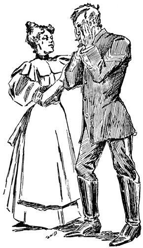 Waller's face was twitching and working; he cleared his throat and tried to speak; he dashed his hand across his eyes and ground his heels into the gravel of the[42] walk; he heard the kind and gentle voices of the ladies joining in the chorus of congratulation, but he could not see their faces; a mist had risen before his eyes. Even the old formula, "I thank the captain's lady," had deserted him. He mumbled some inarticulate words, and then, in dread of disastrous breakdown, turned suddenly away and strode across the drive. More than one woman was in tears. There was not a ripple of faintest laughter when it was seen that in his blindness the old sergeant had collided with the tree box at the edge of the acequia. Straight to his humble quarters he went; but they were beautiful to him, radiant with the light of joy, pride, gratitude, and[43] love that beamed and burnt in his honest heart.