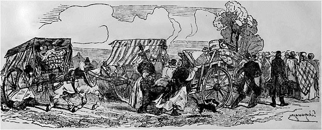 Enfin le branle-bas général a commencé; cette heure attendue avec tant d'impatience a sonné, et tous, petits et grands, font leurs préparatifs de départ. Pas un ne reste inactif dans cette grande ruche où rien ne manque, ni la reine, ni le miel, ni les travailleuses, ni les frelons. De toutes les rues, vers toutes les barrières, voyez s'avancer ces hordes d'émigrants: ils ont fait de tendres adieux à ceux qui, moins heureux qu'eux, forment la partie non flottante de la population. Ils sont tristes de les quitter, mais cette douce tristesse, empreinte sur leur physionomie est tempérée par un rayon de joie; car enfin ils vont respirer à pleine poitrine l'air pur de la banlieue, y compris la Villette et Montfaucon.