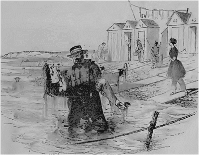 La manière de prendre les bains à Boulogne diffère de celle des autres ports de mer. Chaque baigneur monte dans une voiture élégante et commode qui forme cabinet de toilette; quelques-unes même peuvent contenir plusieurs personnes à l'aise. Un cheval (accoutumé à ce genre de travail, à ce que prétend un guide du voyageur) conduit la voiture au milieu de l'eau où elle reste immobile. Une tente en coutil y est adaptée, et c'est quelquefois sous son abri que se prend le bain, sans que les femmes aient à craindre les regards indiscrets.