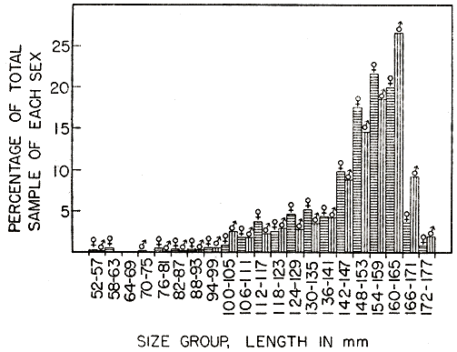 Since rate of growth changes rapidly, with a slowing trend, only those young voles that were recaptured within a few weeks showed the approximate growth rate for any specific portion of the ontogenetic curve. Table 5 summarizes the records of 98 such young sorted into size groups representative of several stages in development. The slowing trend of growth in voles that are nearing subadult size is well shown by these records. Throughout the greater part of the growth curve no difference could be found in rate between the sexes. It is only after sexual maturity has been attained and growth has become relatively slow that males become noticeably larger than females. This tendency for continued growth in the adult males results in a much more marked disparity in size between the sexes in the oldest voles, as evident in Fig. 2.