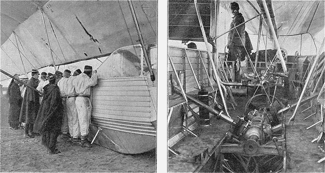 | La légitime curiosité française s'exerçant sur l'intérieur de la nacelle arrière, dont l'avant est muni d'un capot en mica. | L'intérieur de la nacelle arrière, après l'enlèvement d'un de ses deux moteurs. (Au premier plan, le quadruple embrayage.) |