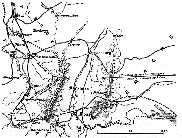 Ce qu'il y a de certain, c'est que le dirigeable naviguait. Le vent régnant ce matin-là dans toute la région était du nord-est (1); par conséquent, le Zeppelin marcha avec un vent de côté contre lequel il eut à lutter jusqu'à Lunéville.