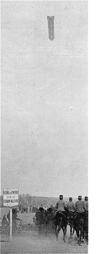On suit naturellement le Zeppelin à la lorgnette; soudain, l'esquif aérien s'incline fortement, l'axe longitudinal du ballon accuse un angle d'environ 45° avec l'horizontale. Le dirigeable vire de bord, revient vers l'immense espace de 200 hectares que constitue le champ de manoeuvres. L'aéronat paraît à bout de lest, ses passagers agitent leurs mouchoirs blancs. Le Zeppelin frôle, nous dit-on, un réservoir à eau, passe de justesse au-dessus des arbres en bordure du champ et touche terre, un peu brusquement, tandis que sur le terrain évolue le 17e régiment de chasseurs.