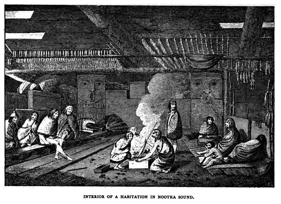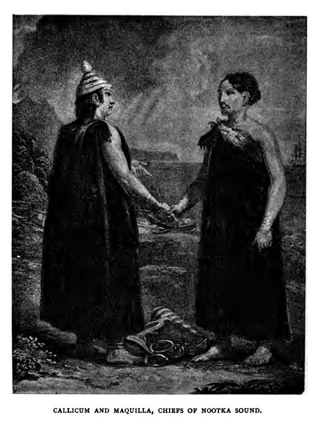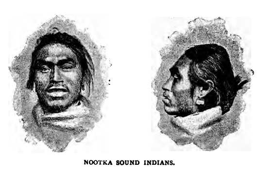 When I visited Nootka Sound in 1863, fifty-eight years had passed since the captivity of the author of this book. In the interval [40] many things had happened. But though the Indians had altered in some respects, they were perhaps less changed than almost any other savages in America since the whites came in contact with them. Eighty-five years had passed since Cook had careened his ships in Resolution Cove, and seventy since Vancouver entered the Sound on his almost more notable voyage. Yet the bricks from the blacksmith's forge, fresh and vitrified as if they had been in contact with the fire only yesterday, were at times dug up from among the rank herbage. The village in Friendly Cove—a spot which not a few mariners found to be very unfriendly—differed in no way from the picture in Cook's Voyage; and though some curio-hunting captain had no doubt long ago carried off the mortar and emblazoned brasses, the natives still spoke traditionally of Cook and Vancouver, and were ready to point out the spots where in 1788 Meares built the North-West America and the white men had cultivated. Memories of Martinez and Quadra existed in the shape of many legends, of Indians with Iberian features, and of several old people who by tradition (though some of them were old enough to have remembered these navigators), could still repeat the Spanish numerals. And the head chief of the Mooachahts in Friendly Cove—vastly smaller though his tribe was, and much abridged his power—was a grandson of Maquenna, called by the same name, and had many of his worst characteristics. This fact I am likely to remember. For he had been accused of having murdered, in the previous January, Captain Stev of the Trader, and since that time no whites had ventured near him. He, however, assured us that the report was simply a scandal raised by the [41] neighbouring tribes, who had long hated him and his people, and would like to see them punished by the arrival of a gunboat, and that in reality the vessel was wrecked, and the white men were drowned. At the same time, among the voices heard that night at the council held in Maquenna's great lodge, supported by the huge beams described by Jewitt, were some in favour of killing his latest visitors, on the principle that dead men tell no tales. But that the Noes had it, the present narrative is the best proof.
