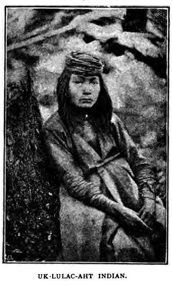 But, after all, the most interesting sight on the shore was the people who inhabited it. They were the "Indians," whom my friend Gilbert Sproat afterwards described as the "Ahts,"[13] for this syllable terminates the name of each of the many little tribes into which they are divided. Yet, with a disregard of the laws of nomenclature, the Ethnological Bureau at Washington has only recently announced its intention of knowing them officially by the meaningless title of "Wakashan." They are a people by themselves, speaking a language which was confined to Vancouver Island, with the exception of Cape Flattery, the western tip of Washington, where the Makkahs speak it. In Vancouver Island, a region about the size of Ireland, three, if not four distinct aboriginal tongues are in use, in addition to Chinook Jargon, a sort of lingua franca employed by the Indians in their intercourse with the whites or with tribes whose speech they do not understand. The Kawitshen (Cowitchan) with its various dialects, the chief of which is the Tsongersth (Songer) of the people near Victoria, prevails from Sooke in the Strait of Juan de Fuca, northwards to Comox. From that point to the northern end of the island various dialects of the Kwakiool (Cogwohl of the traders) are the medium in which the tribesmen do not conceal their thoughts. The people of Quatseno and Koskeemo Sounds, owing to their frequent intercourse with Fort Rupert on the other side of the island, which at this point is at its narrowest, understand and frequently speak the Kwakiool. But after passing several days entirely alone among these people, I can vouch for the fact that this dialect is so peculiar that it almost amounts to a separate language. However, from this part, or properly, from Woody Point southwards to Port San Juan, the Aht language is entirely different.