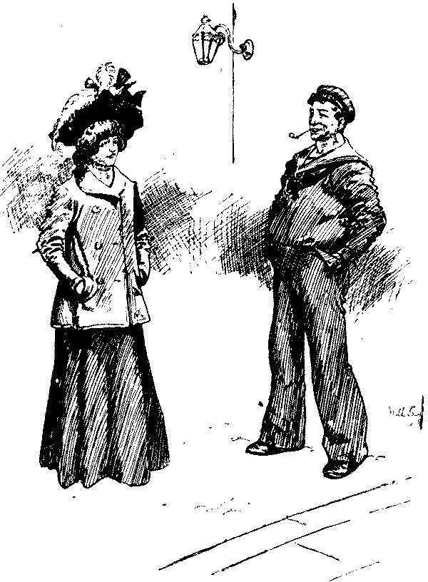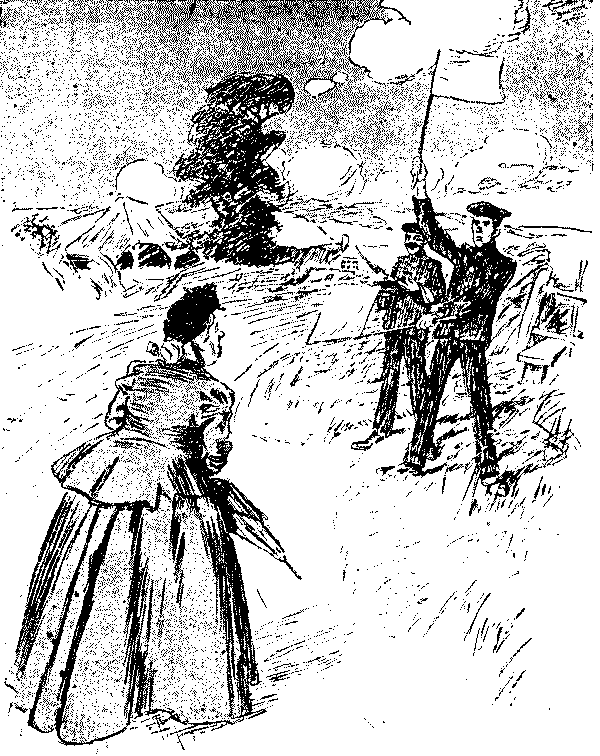 Old Lady (to member of signalling section, who has just commenced to reply to a message). "Young man, if you think to alarm me by wagging those flags about, you are very much mistaken!"