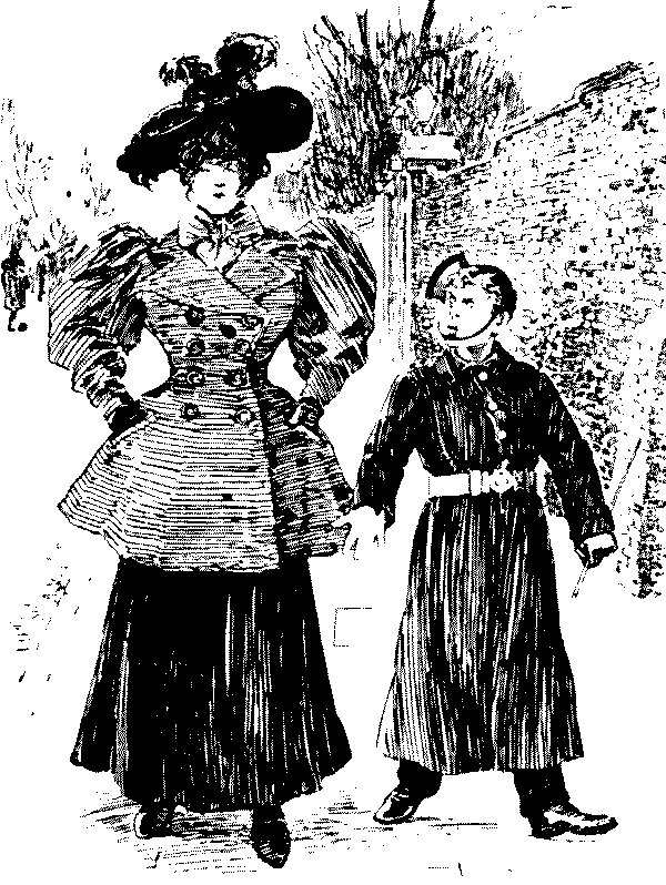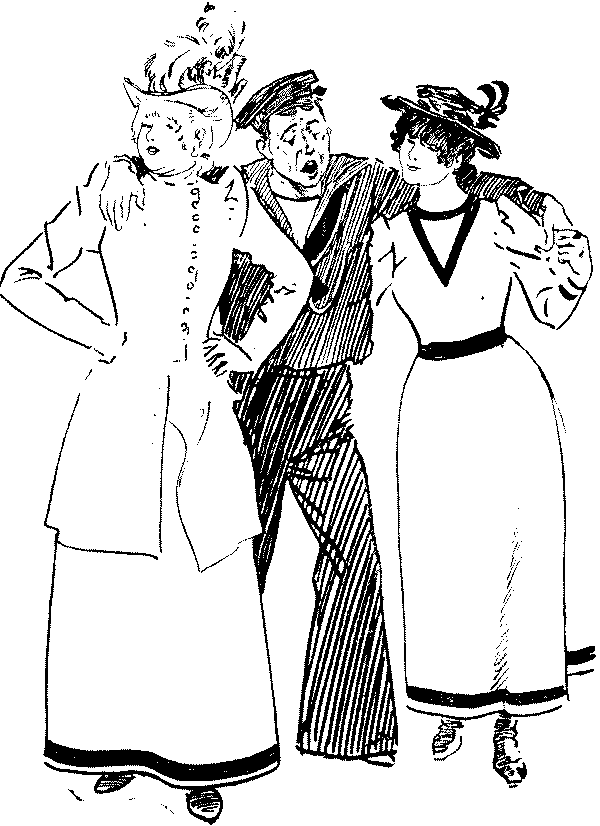 How to represent the Navy.—Short skirt decorated with brooch anchors. Garibaldi with naval collar. Bag hanging from waist-belt with silver letters H.M.S. Coquette. Hair built up à la "Belle of New York" surmounted with a small sailor hat decorated with streamers.