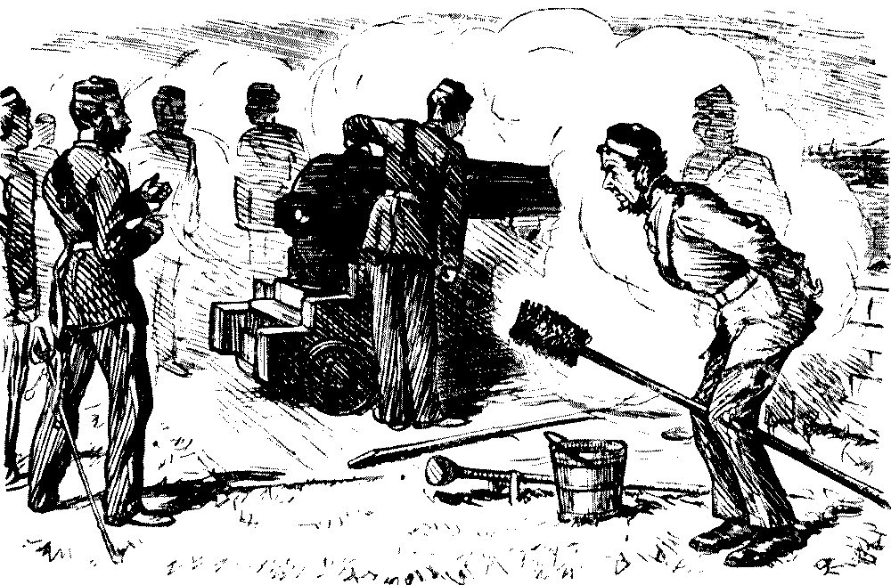 Convicted Contractor. "Look here! I can't walk in these boots, and I can't eat this food!"