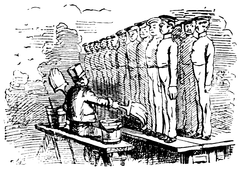 Orderly Sergeant (to officer). "Beg your pardon, sorr, but 'm wan ration short. Who will I give it to?"