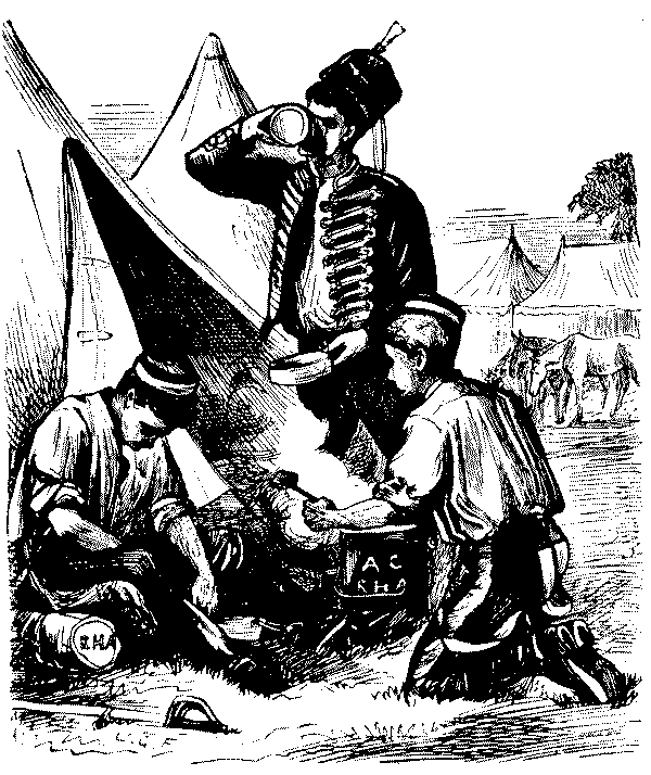 Dear Field-Marshal Punch.—In a telegram from the seat of war this week I find the following obscure passage. "General Blank held the enemy's main body whilst General Dash carried out his movements." Knowing your skill in tactics, may I ask if you can explain this to me either verbally or pictorially. Used in contradistinction to his main body, I presume the enemy's "movements" must be his limbs, and if all four were carried out by this barbarous general, it would be certainly a feat of arms, and the movement might be said to be al-leg-ro. Nothing is said as to whether the enemy survived this fearful operation depriving him of his members, but it may be a case of a truncated despatch. Then, where were the movements carried out to? If the presumption stated above be correct, I infer it must have been to the region of limbo, but the army in Flanders never practised such lopsided manœuvres.