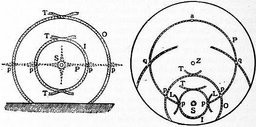 In physical science, a halo is a luminous circle, surrounding the sun or moon, with various auxiliary phenomena, and formed by the reflection and refraction of light by ice-crystals suspended in the atmosphere. The optical phenomena produced by atmospheric water and ice may be divided into two classes, according to the relative position of the luminous ring and the source of light. In the first class we have halos, and coronae, or “glories,” which encircle the luminary; the second class includes rainbows, fog-bows, mist-halos, anthelia and mountain-spectres, whose centres are at the anti-solar point. Here it is only necessary to distinguish halos from coronae. Halos are at definite distances (22° and 46°) from the sun, and are coloured red on the inside, being due to refraction; coronae closely surround the sun at variable distances, and are coloured red on the outside, being due to diffraction.