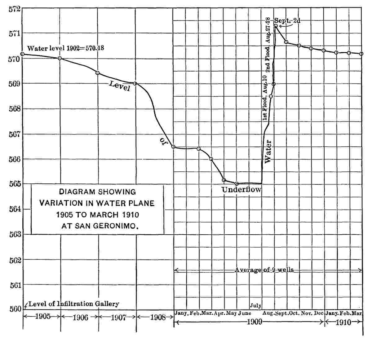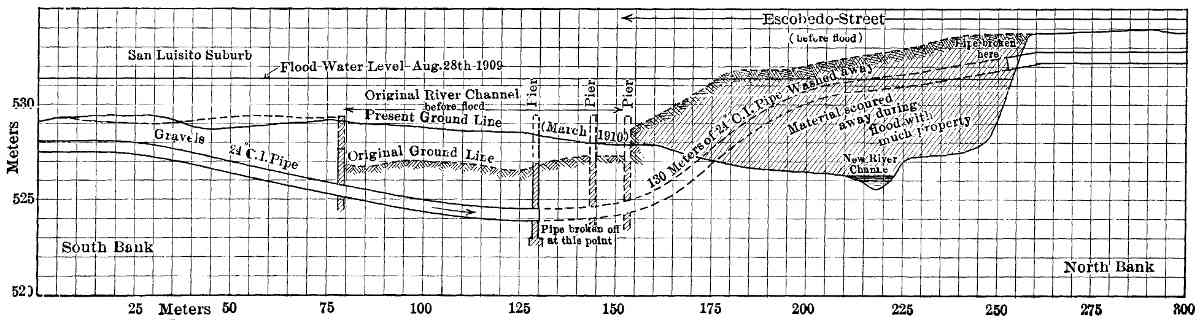 In March, 1906, the Company commenced operations at San Geronimo by sinking a well a few meters north of the then dry bed of the river. Water was found in considerable quantities a few meters below the surface, practically at the level of the river, that is, 570 m. above datum. This supply was used for provisional purposes, and will be referred to later in describing the San Geronimo gravity supply works.