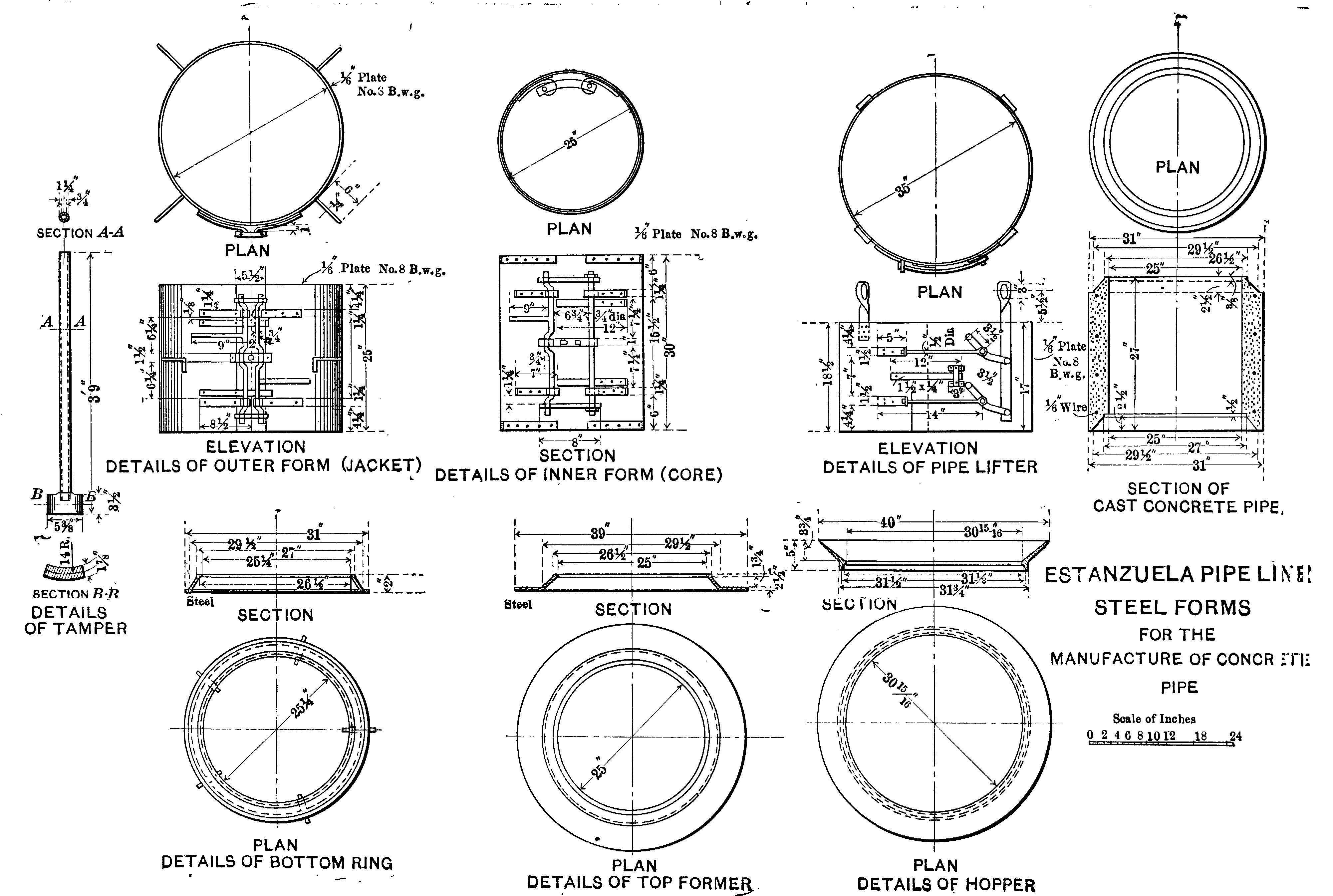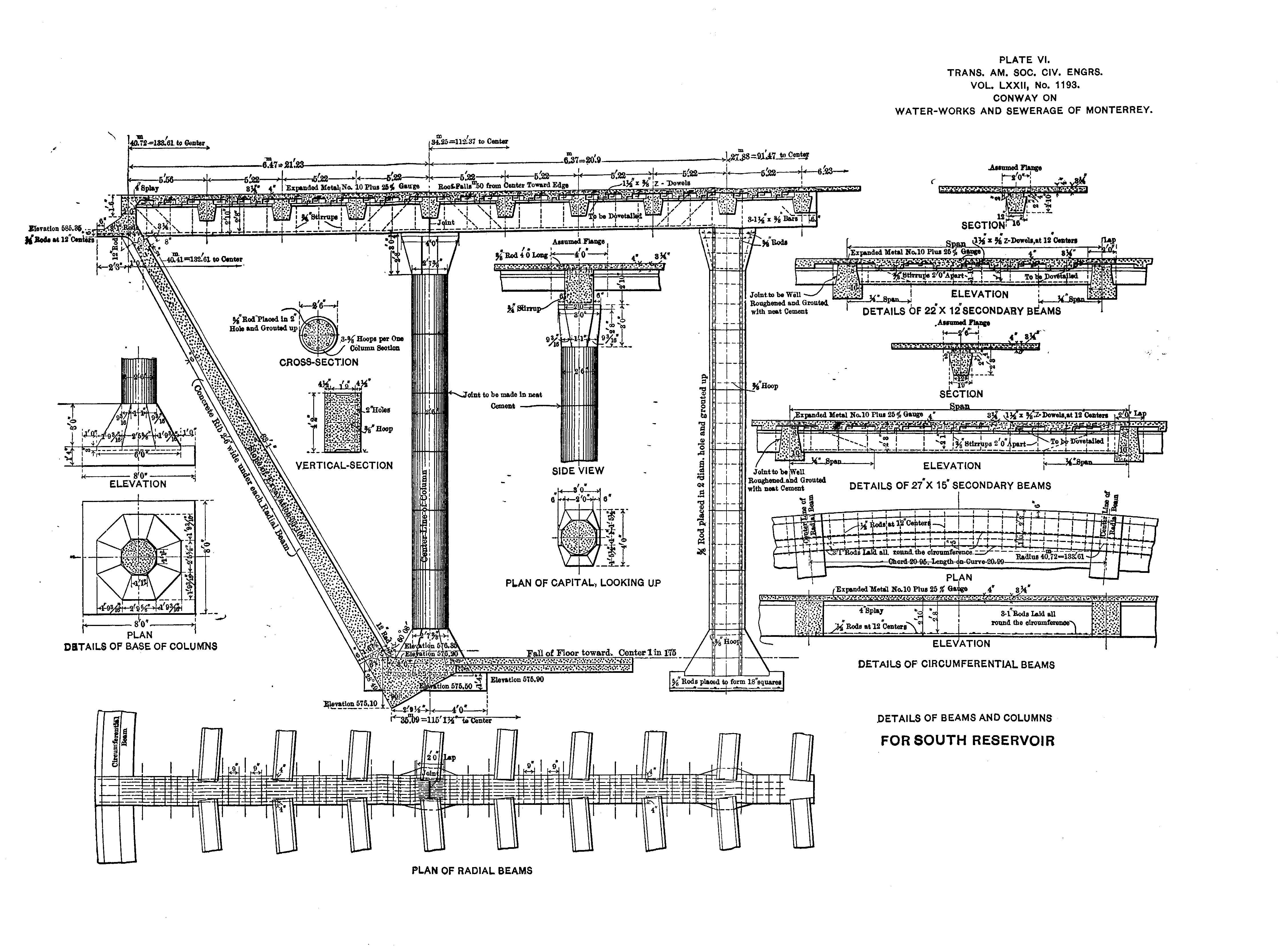 Sand and Rock.—One of the chief difficulties in connection with the construction work in its initial stages was in procuring satisfactory sand for the concrete. An investigation of the quality of all the available sands in the neighborhood of Monterrey resulted in the decision to use a manufactured sand obtained from the calcareous shales in the foot-hills opposite the city, on the south side, and near the site of one of the proposed reservoirs. A quarry was opened, and the raw material was delivered by a gravity plane to a crushing plant, 230 m. from the quarry and at a level about 50 m. lower.