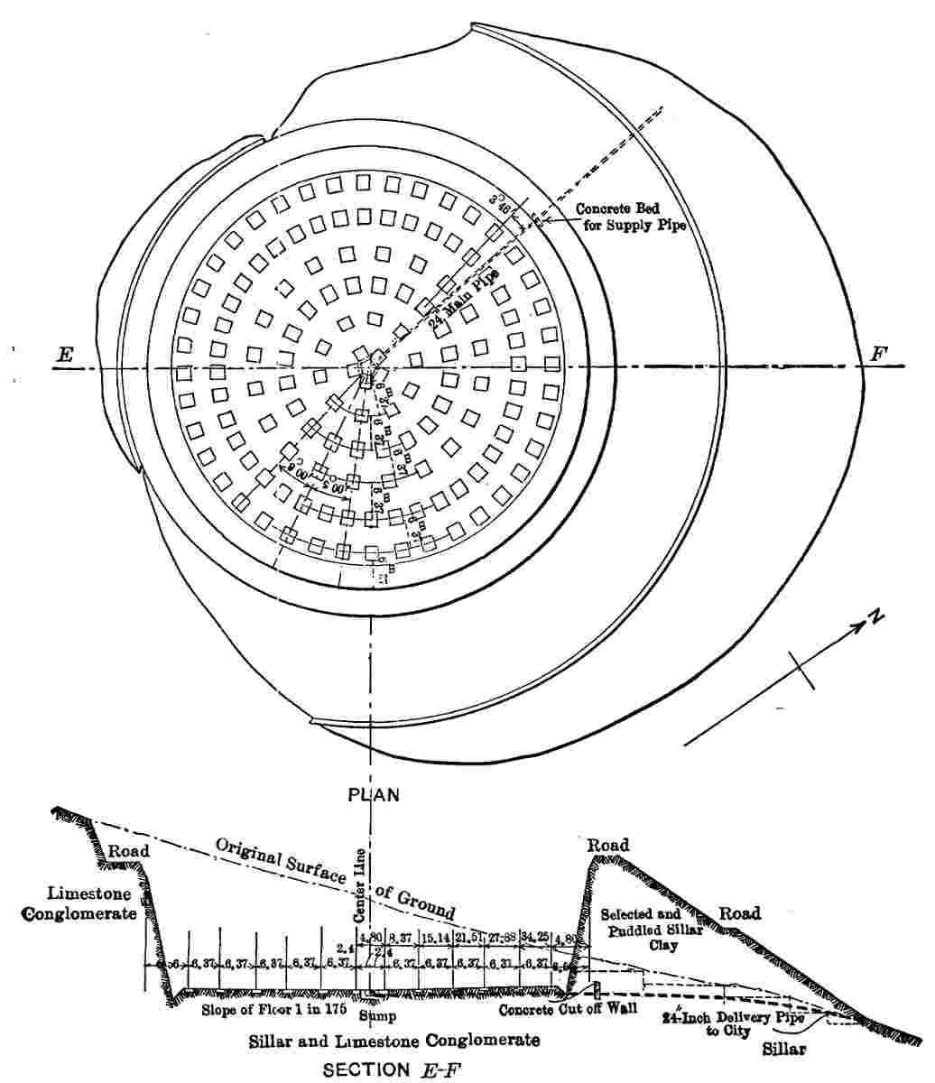 The two sources definitely decided on in July, 1907, were those from Estanzuela and San Geronimo. The works were designed to supply 40,000,000 liters daily, which it was assumed would be sufficient for all future developments for a population of 200,000 at a per capita consumption of 200 liters per day. The present requirements of the city's population, assuming that all the water was supplied by the Company, would be, at that rate, which is a very liberal one, only 18,000,000 liters daily. This, it was thought, would be easily met by the San Geronimo source alone, as it was estimated that it would provide not less than 20,000,000 liters, if the infiltration gallery was driven far enough into the water-bearing gravels.